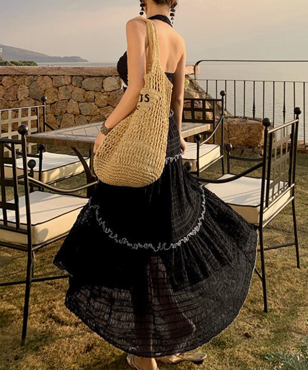 透け感のあるロングスカート付きで、ビーチやリゾートシーンまで幅広く使える三点セット。