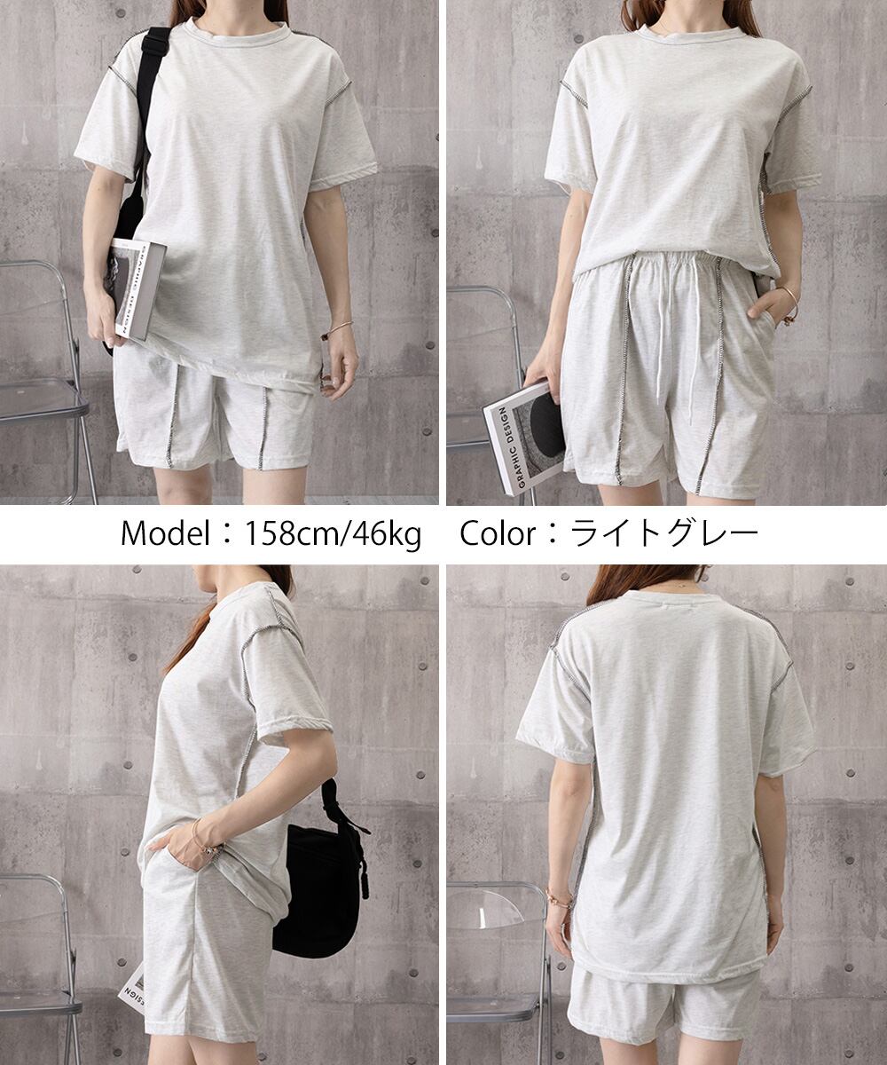 レディース カジュアスウェットセット 体型カバー着やせ ステッチデザインリラックスウエア 半袖部屋着夏 ワンマイルウェア