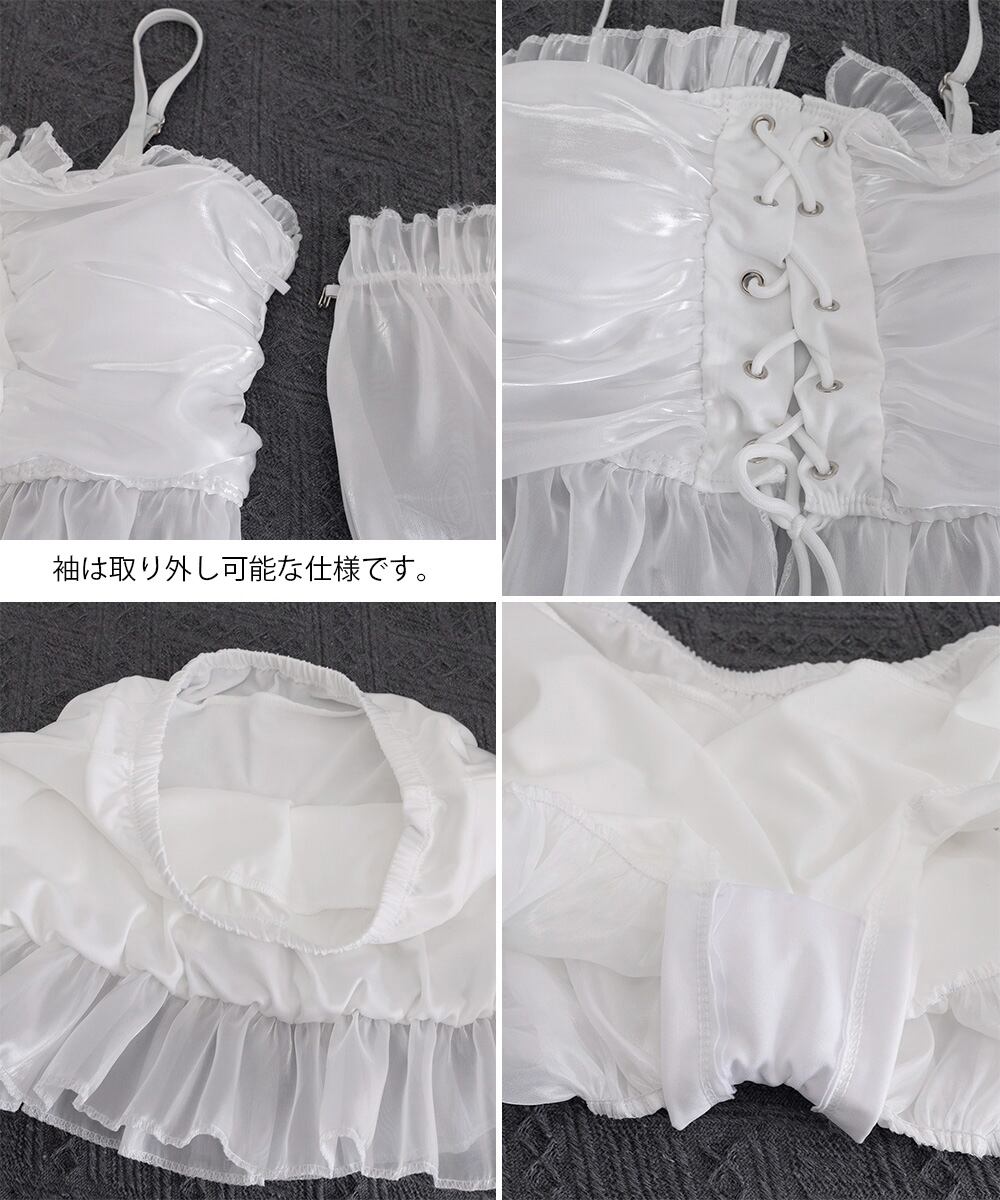 体型カバー水着レディース フリルトップス シアースリーブ付き ショートパンツ一体型スカート 露出控えめY2K風可愛い水着