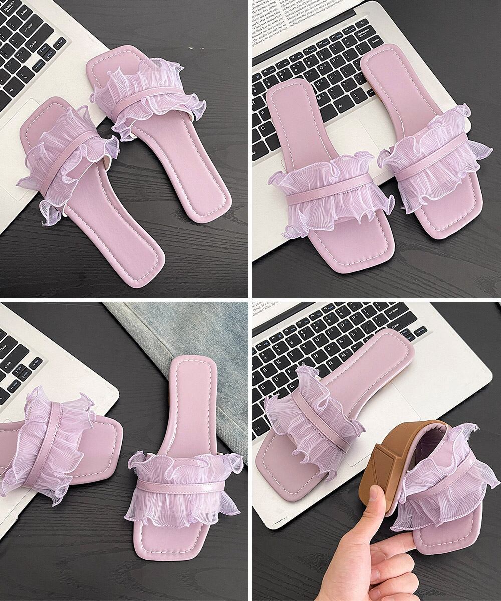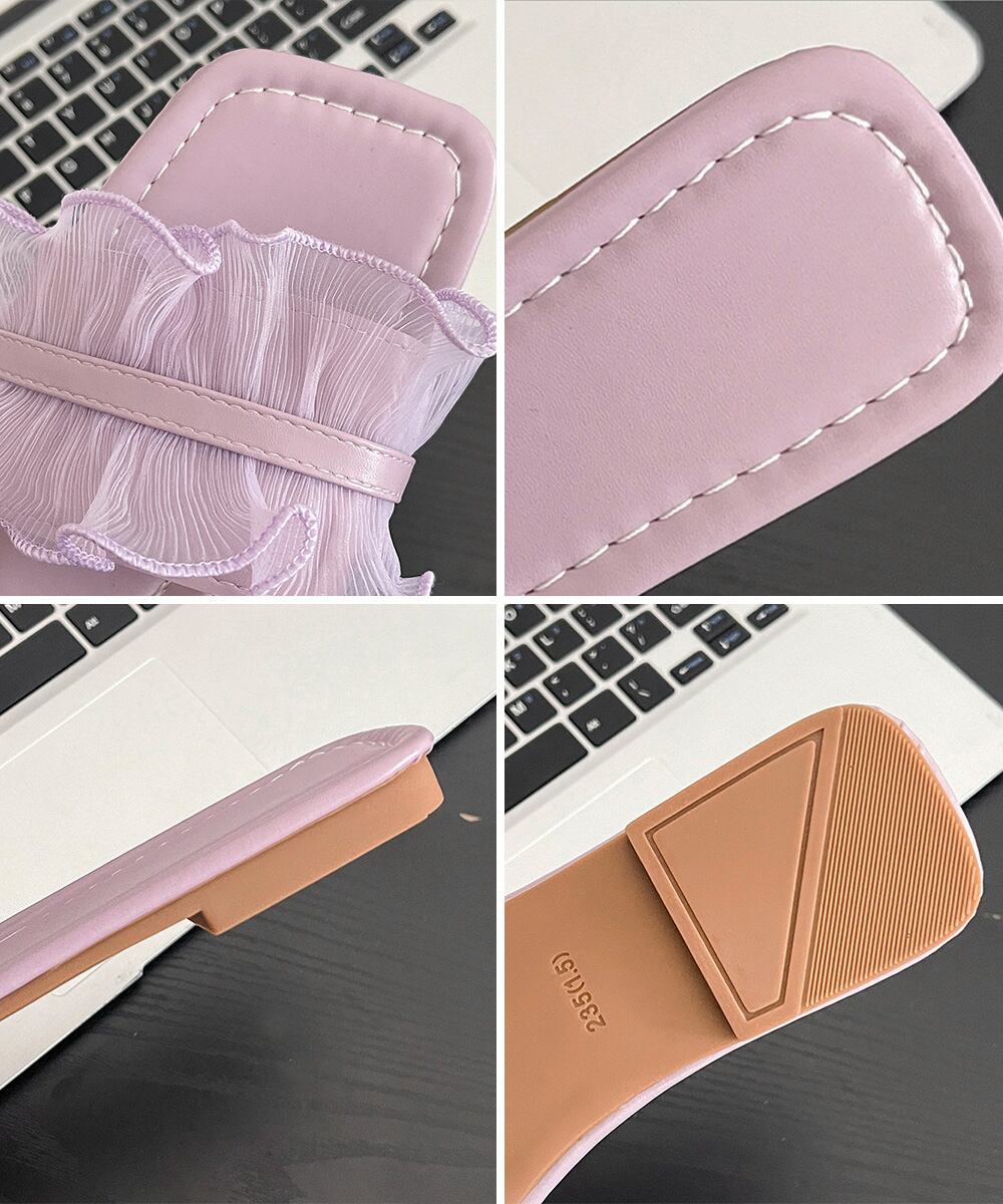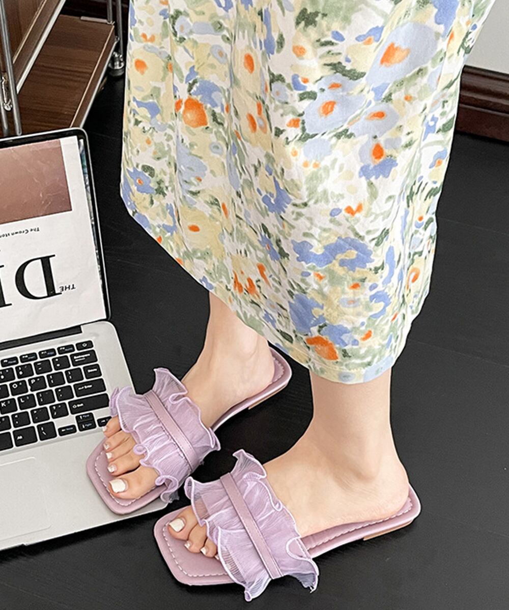 シアー素材のフリルデザインが可愛らしい印象を与えるフラットミュールサンダル。