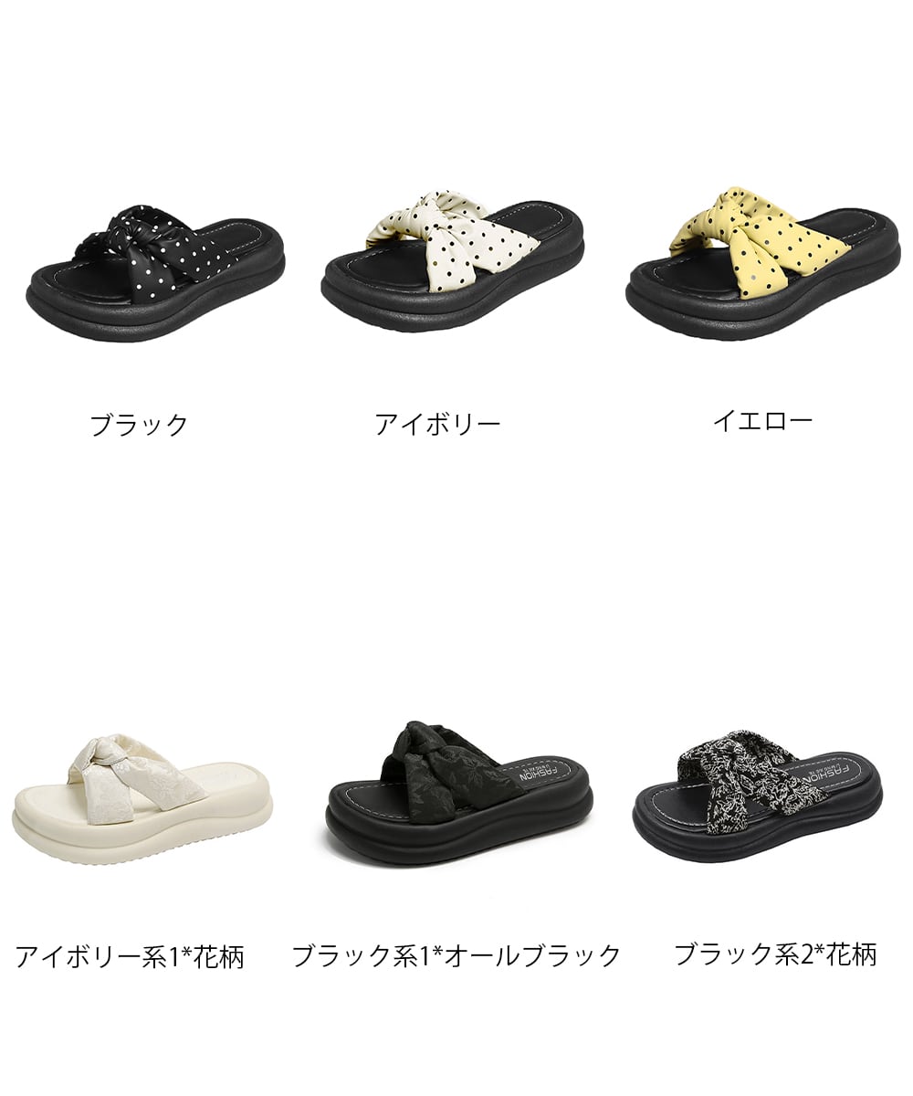大きめのクロスリボンがアクセントになった、ドット柄・花柄の厚底サンダル。