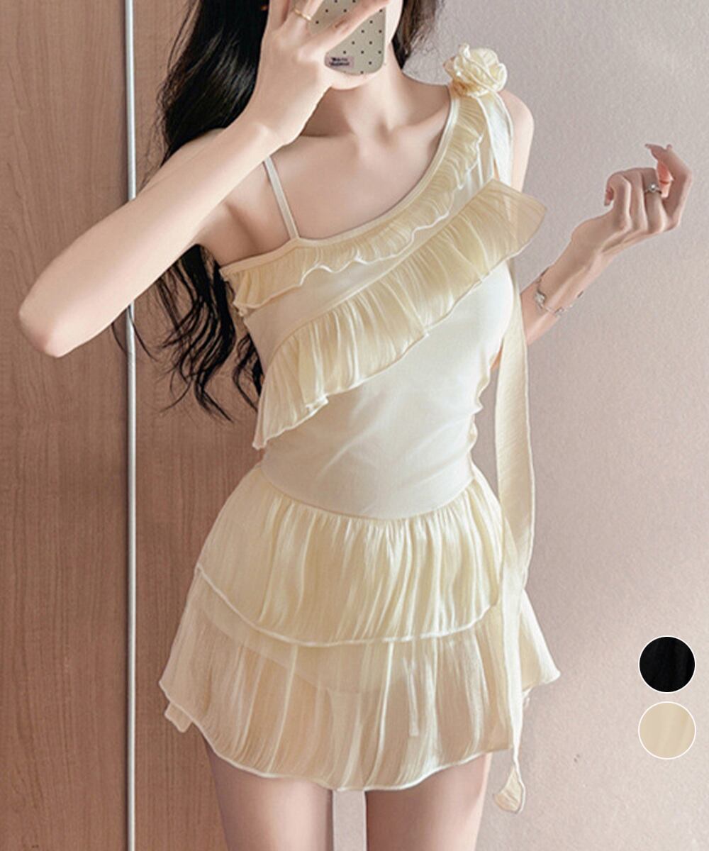 ワンショルダーフリル水着お腹カバー 温泉 リボンスイムウェア 大人可愛い 露出控えめ水着 夏海プール着やせ Y2K風水着
