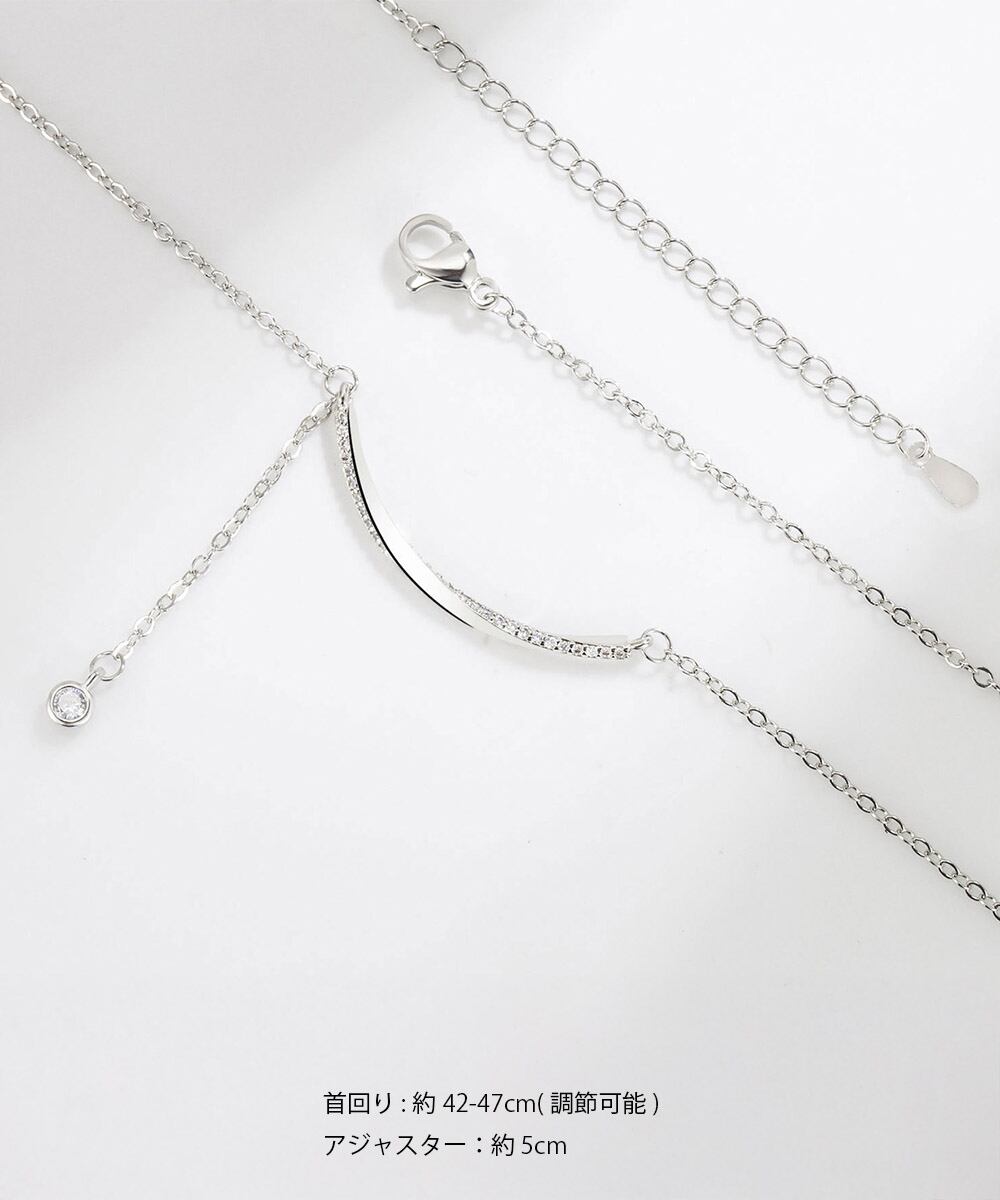 華奢なチェーンとさりげなく揺れるストーンが縦ラインを強調し、首元をすっきり上品に見せる。