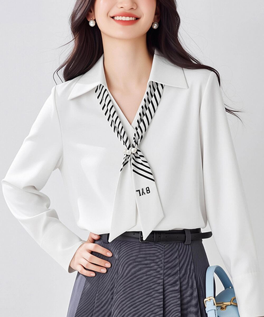 【日本倉庫からの発送】 パール付きスカーフタイシャツブラウス上品 #[84LIUJIE-007_32800]【送料込み】【260419】