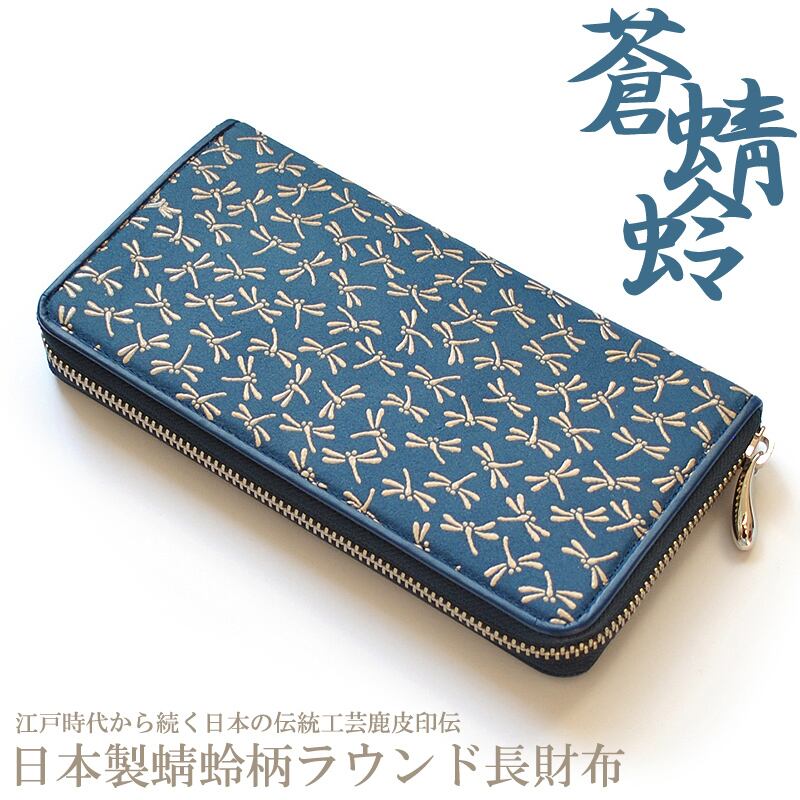 日本国産財布09 鹿革印伝とんぼ柄ラウンドファスナー長財布 蒼蜻蛉 ブルー 男女兼用ロングウォレット #[bztk-09idt103bube_140000]【送料込み】【260419】