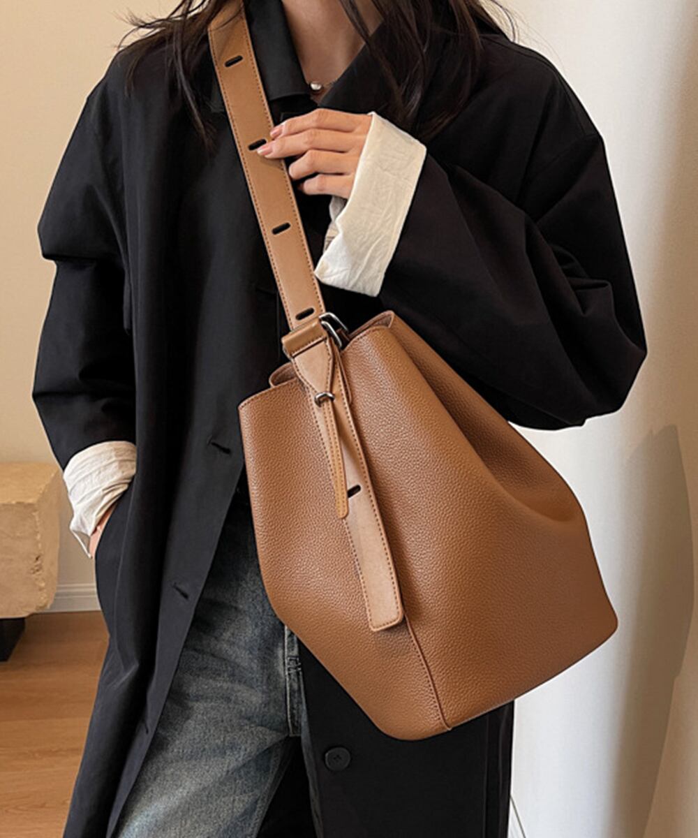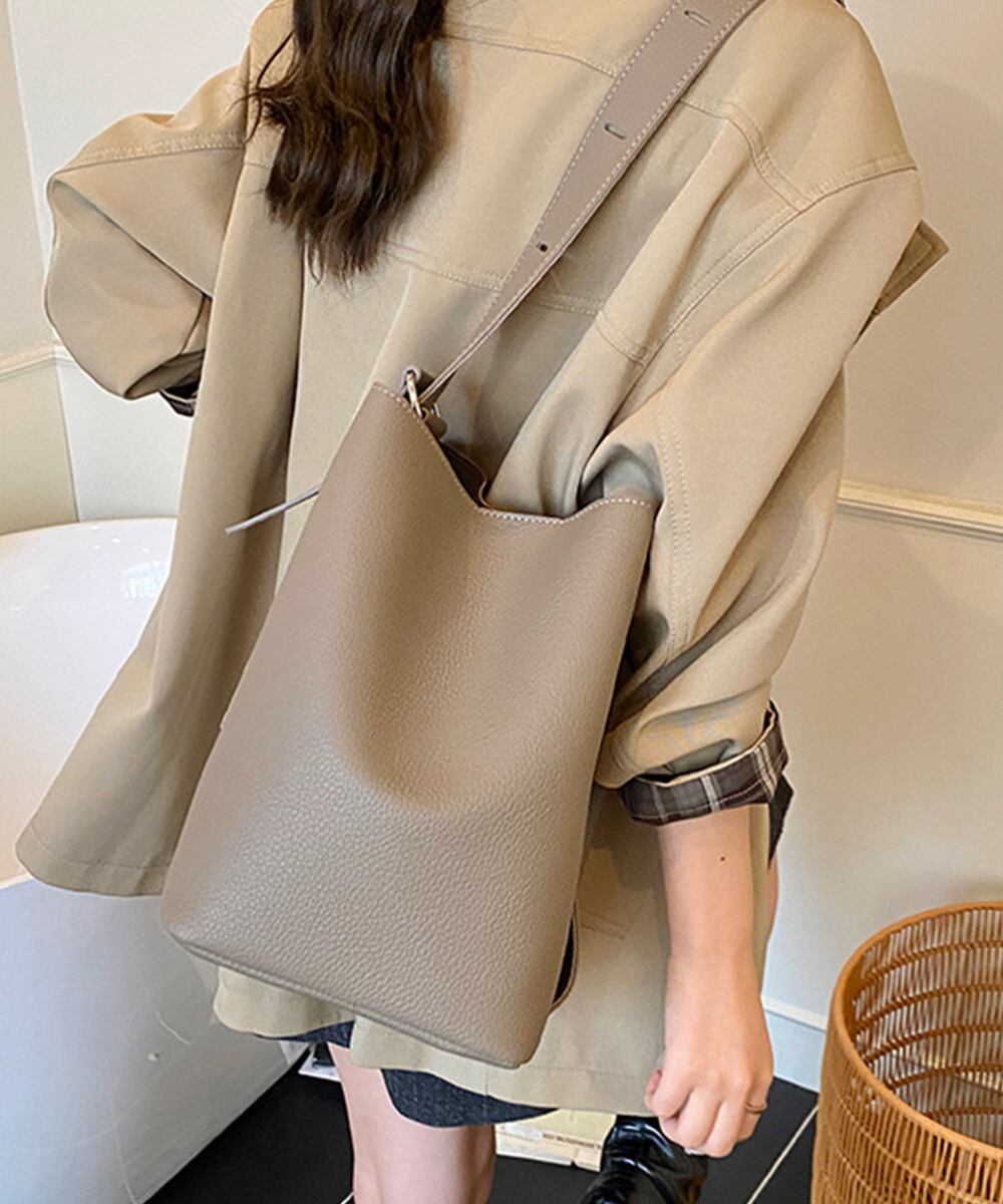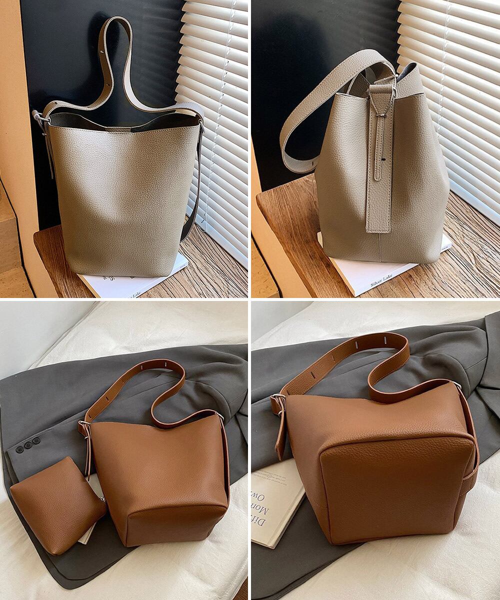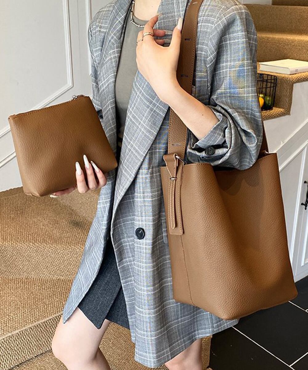 シンプルで洗練されたデザインが魅力の肩掛けバッグとポーチの2点セット。
