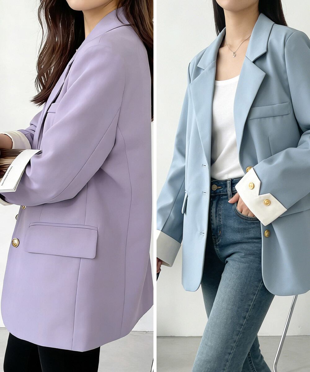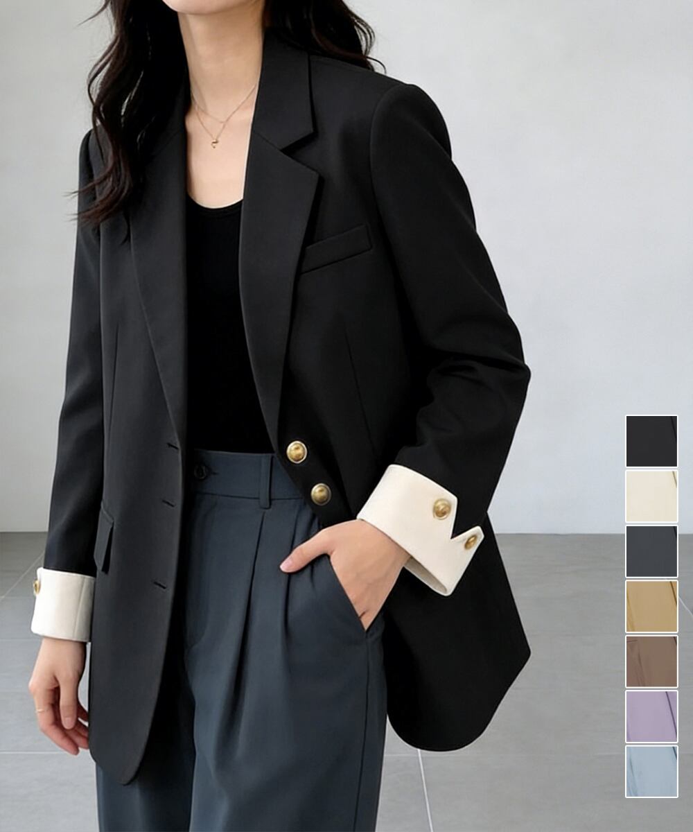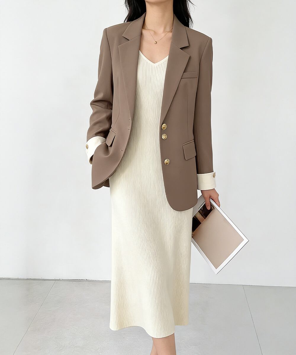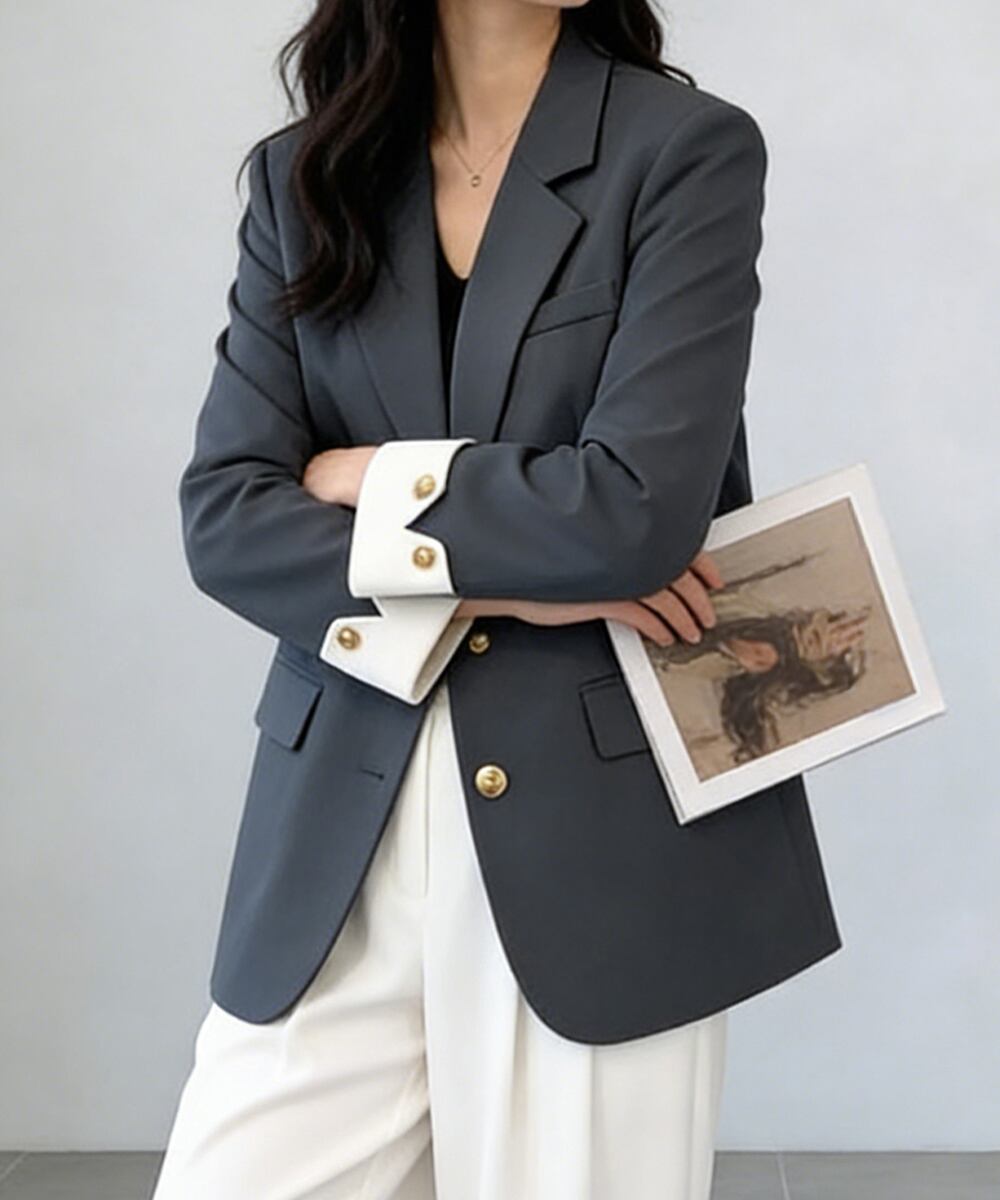 上品な金ボタンがアクセントになった、洗練されたテーラードジャケット。