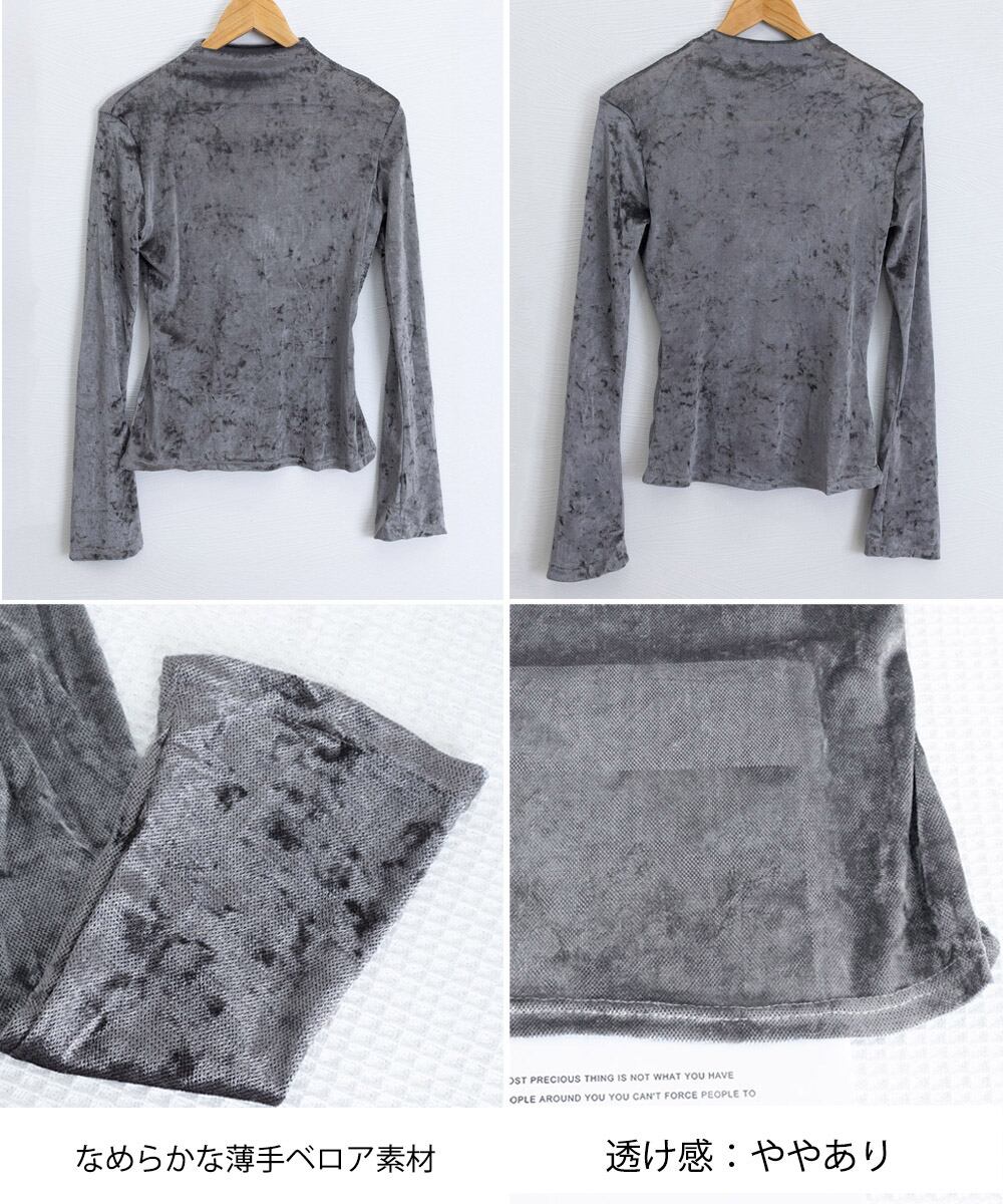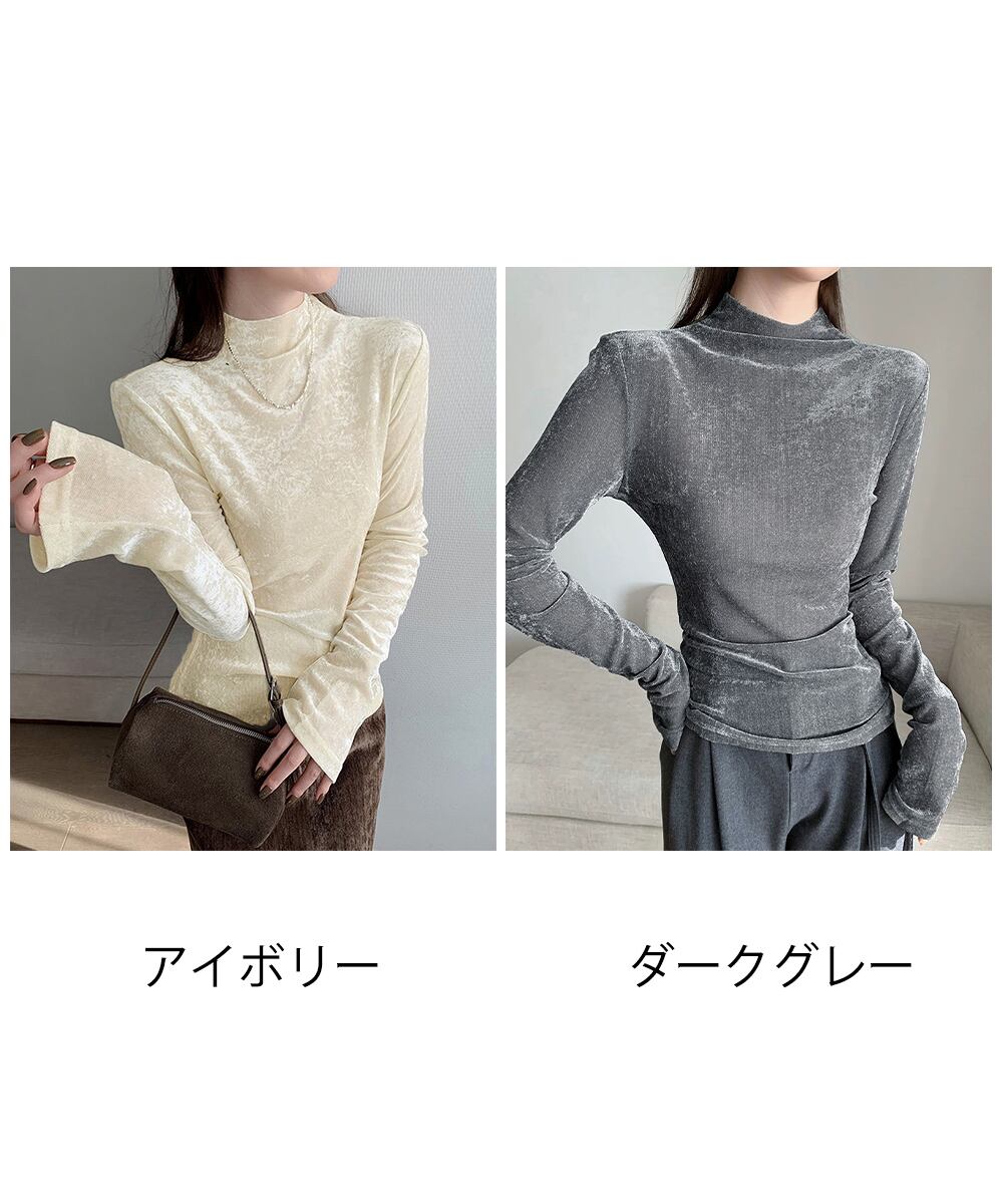 なめらかな質感と上品な光沢が魅力のベロアプチハイネックトップス。