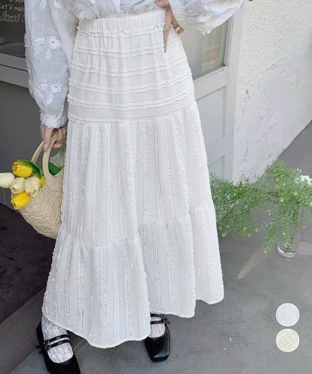 フリルとレースのティアードが重なるロング丈スカート。