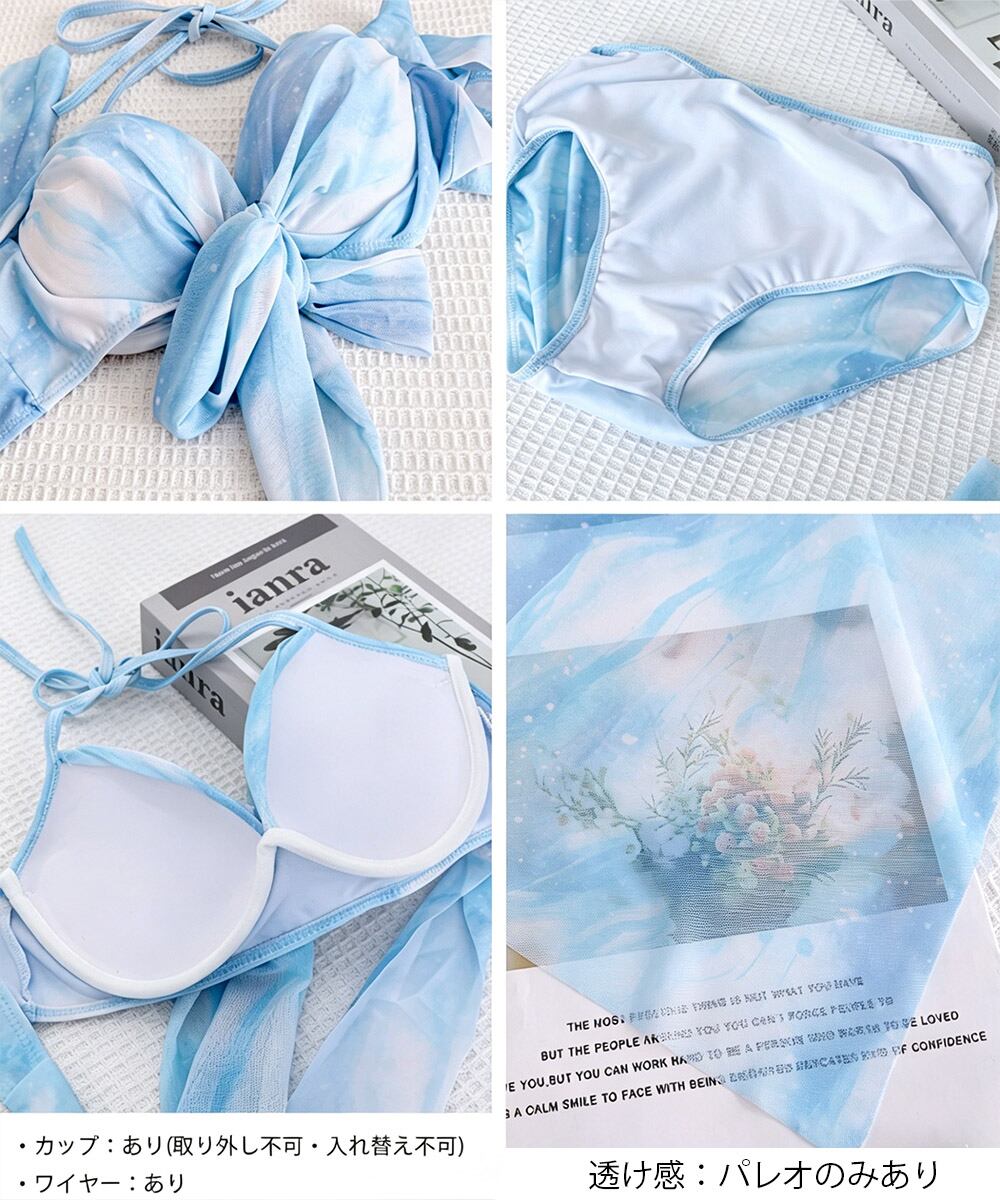 ビキニ3点セット クロスバンドゥ水着 レディース ハイウエスト 2wayビーチウェアバックリボン パレオ付き