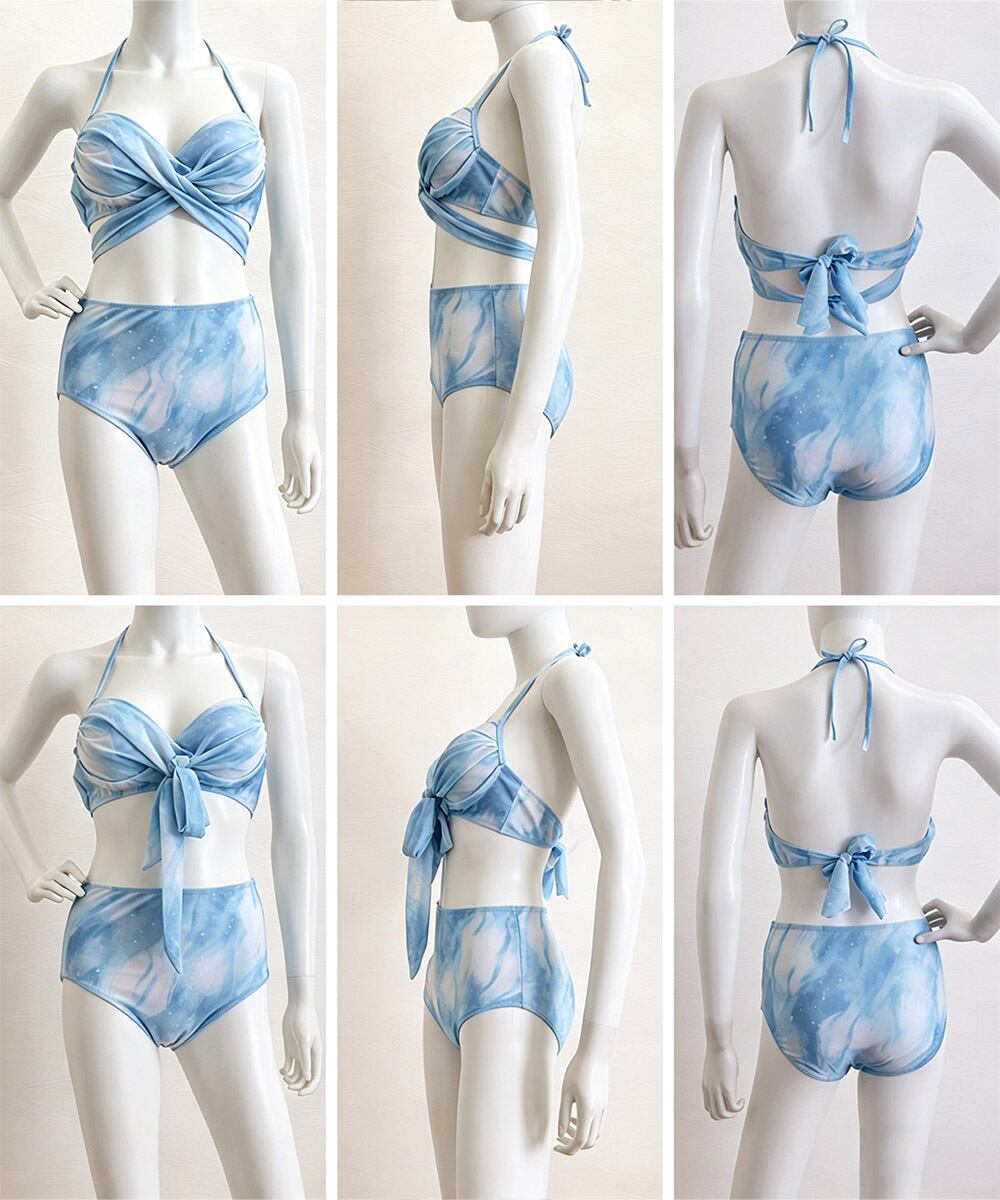 胸元のクロスデザインとホルターネックがバストラインを美しく見せ、女性らしいシルエットを演出するビキニ3点セット。