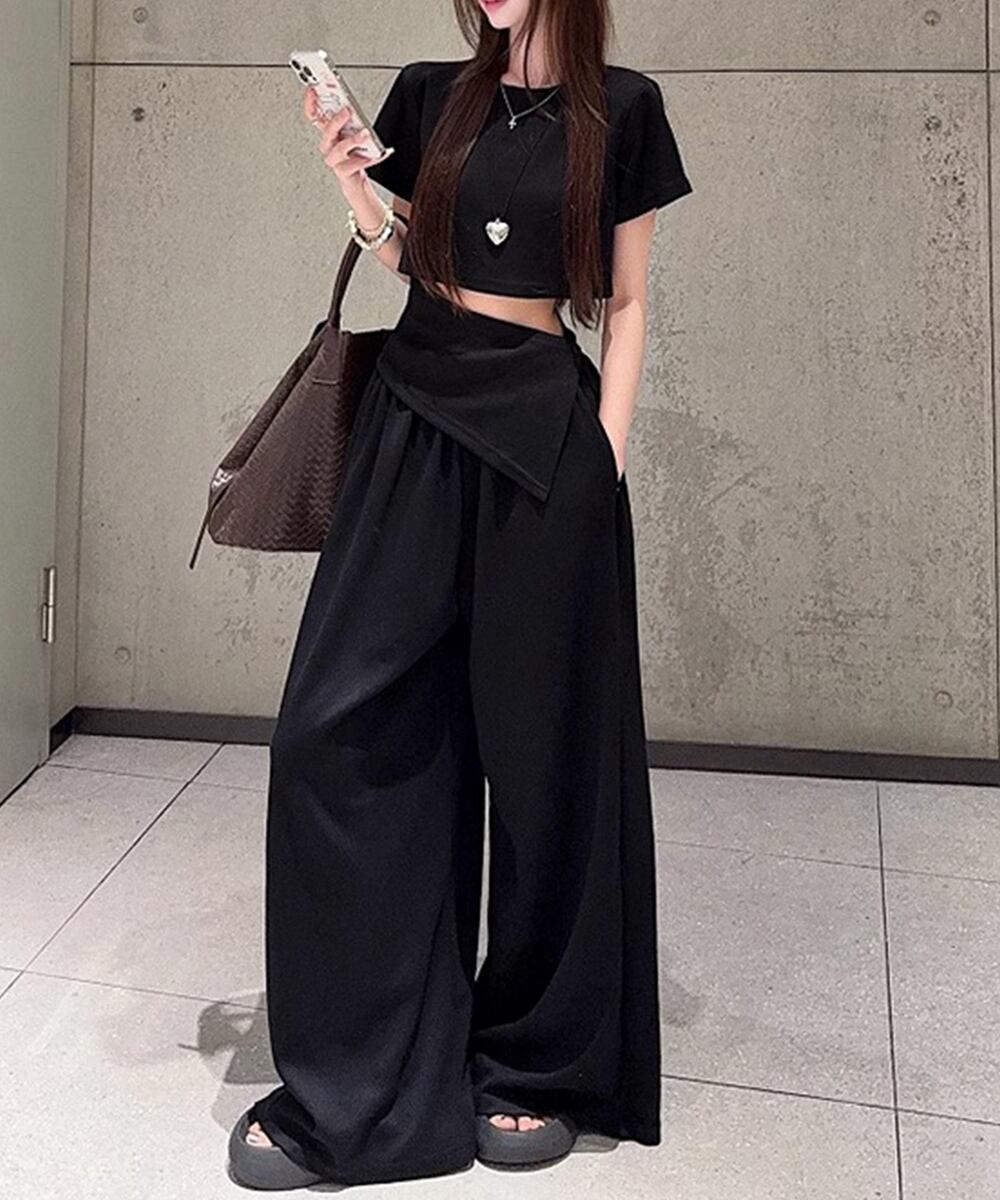 トレンド感のあるクロップド丈トップスとワイドパンツの2点セットアップ。