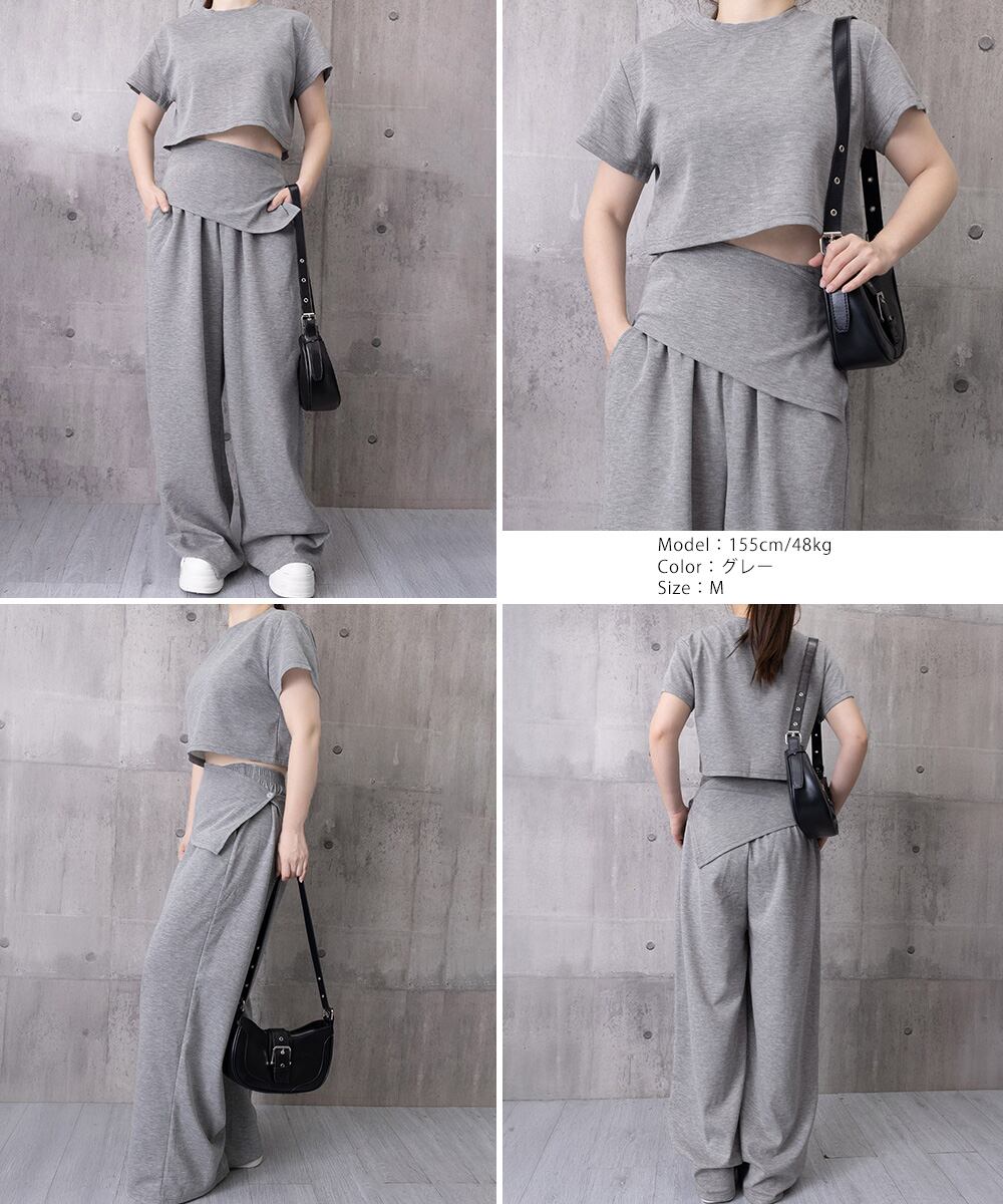 半袖トップス ハイウエストイージーパンツ ヒップカバ付きー2点セットアップ 大人カジュアル 肌見せ上下セット 体型カバー