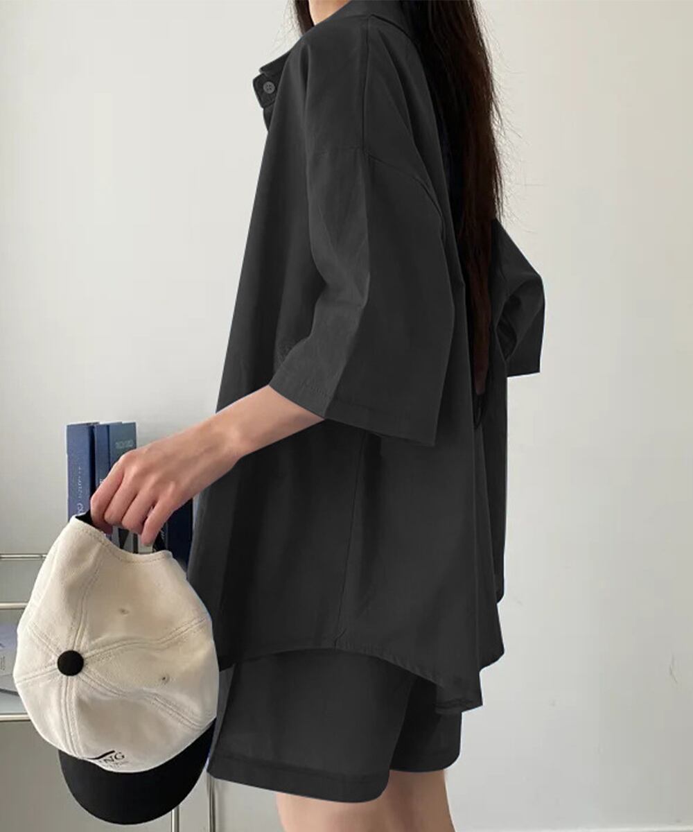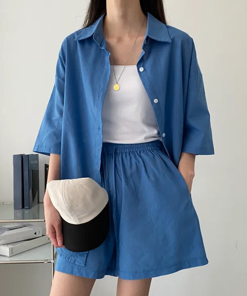 半袖シャツとショートパンツのカジュアルセットアップ。