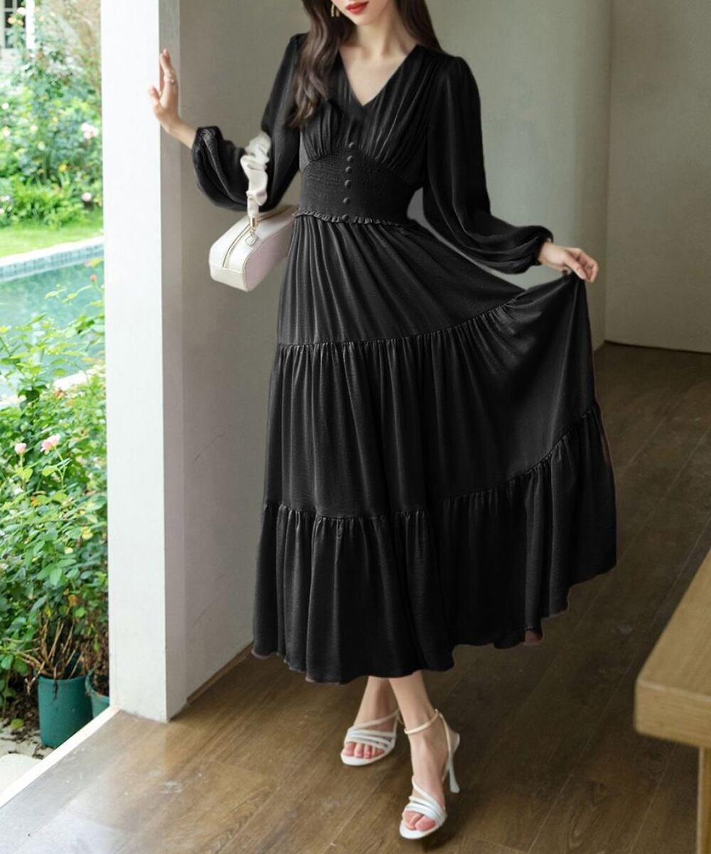 Vネックとティアードデザインが魅力の、上品なロングワンピース。