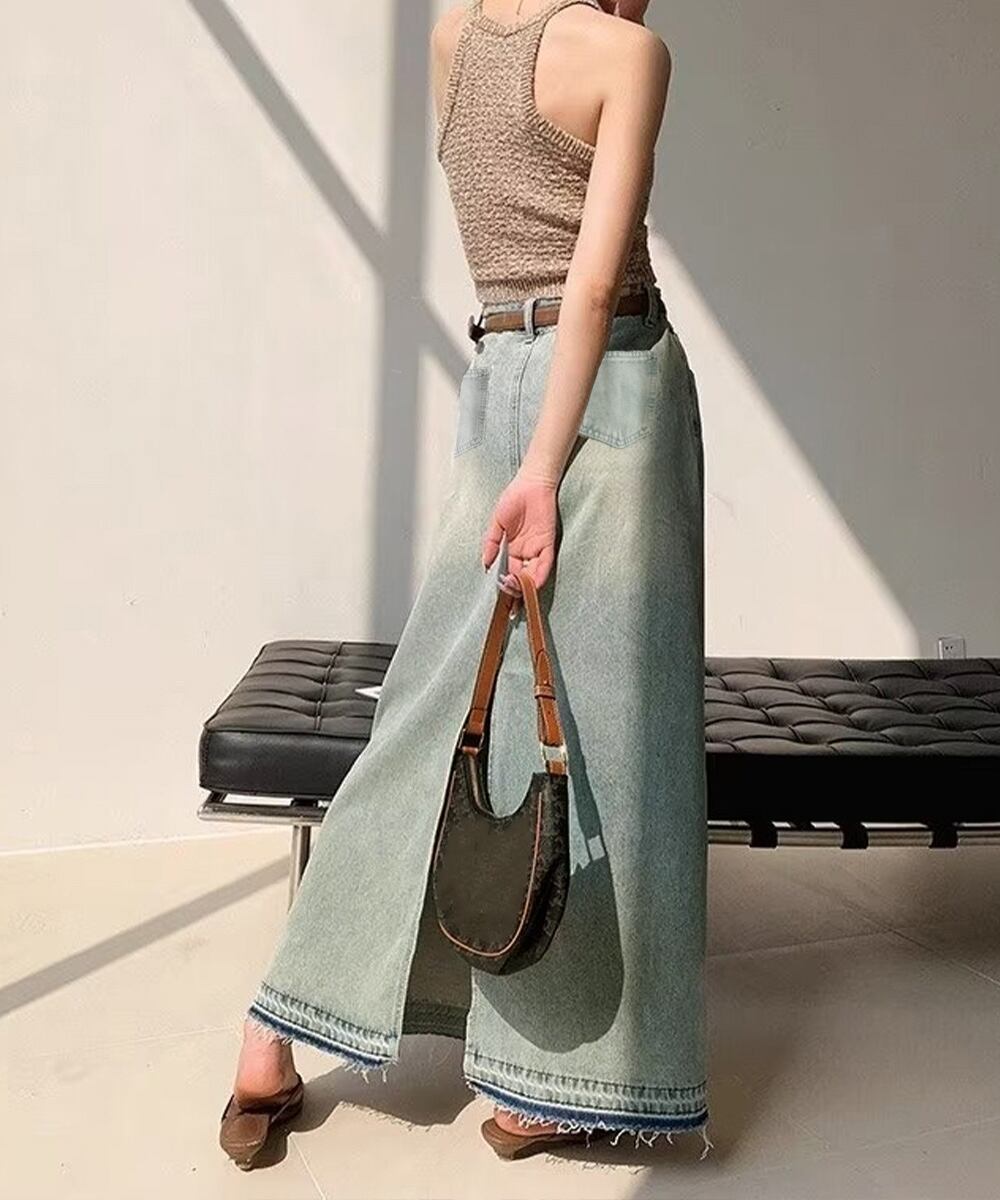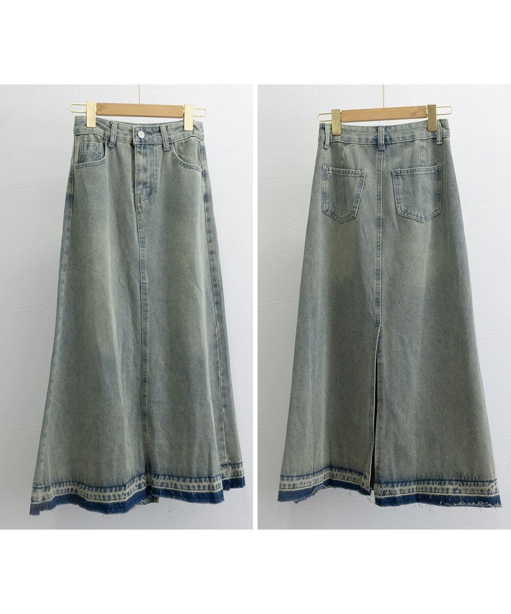 ロングスカートレディース バックスリットAラインスカート 切りっぱなし フリンジヴィンテージ加工スカート オールシーズン