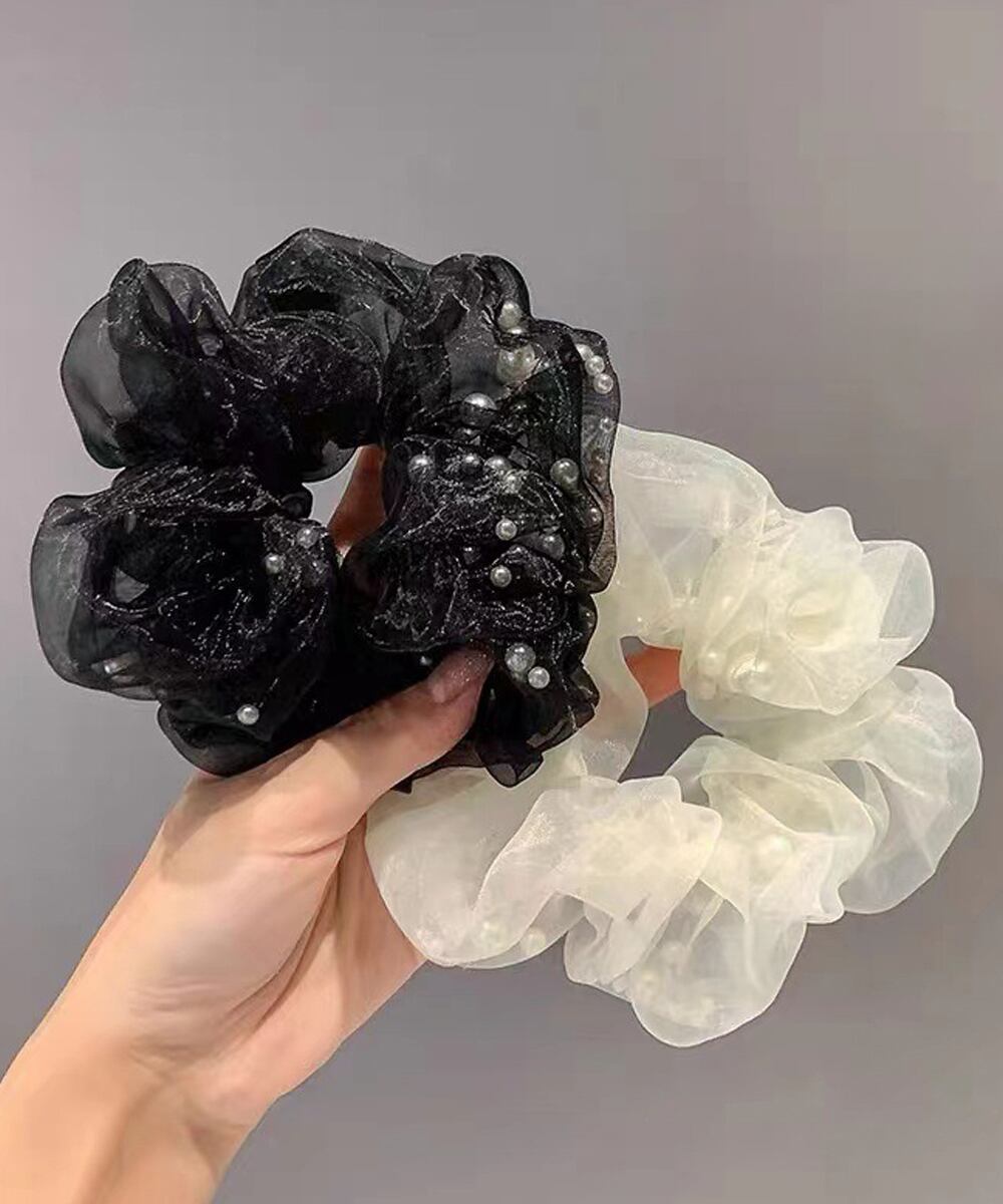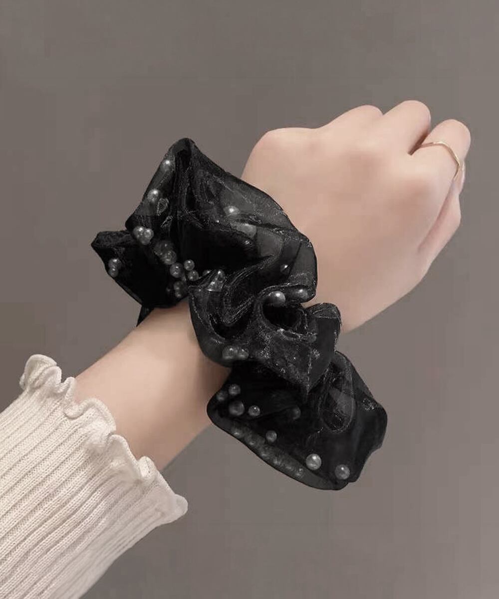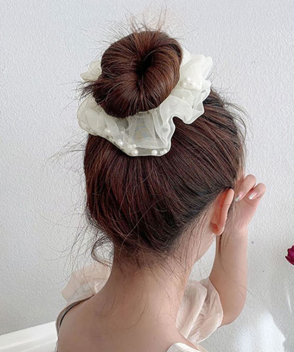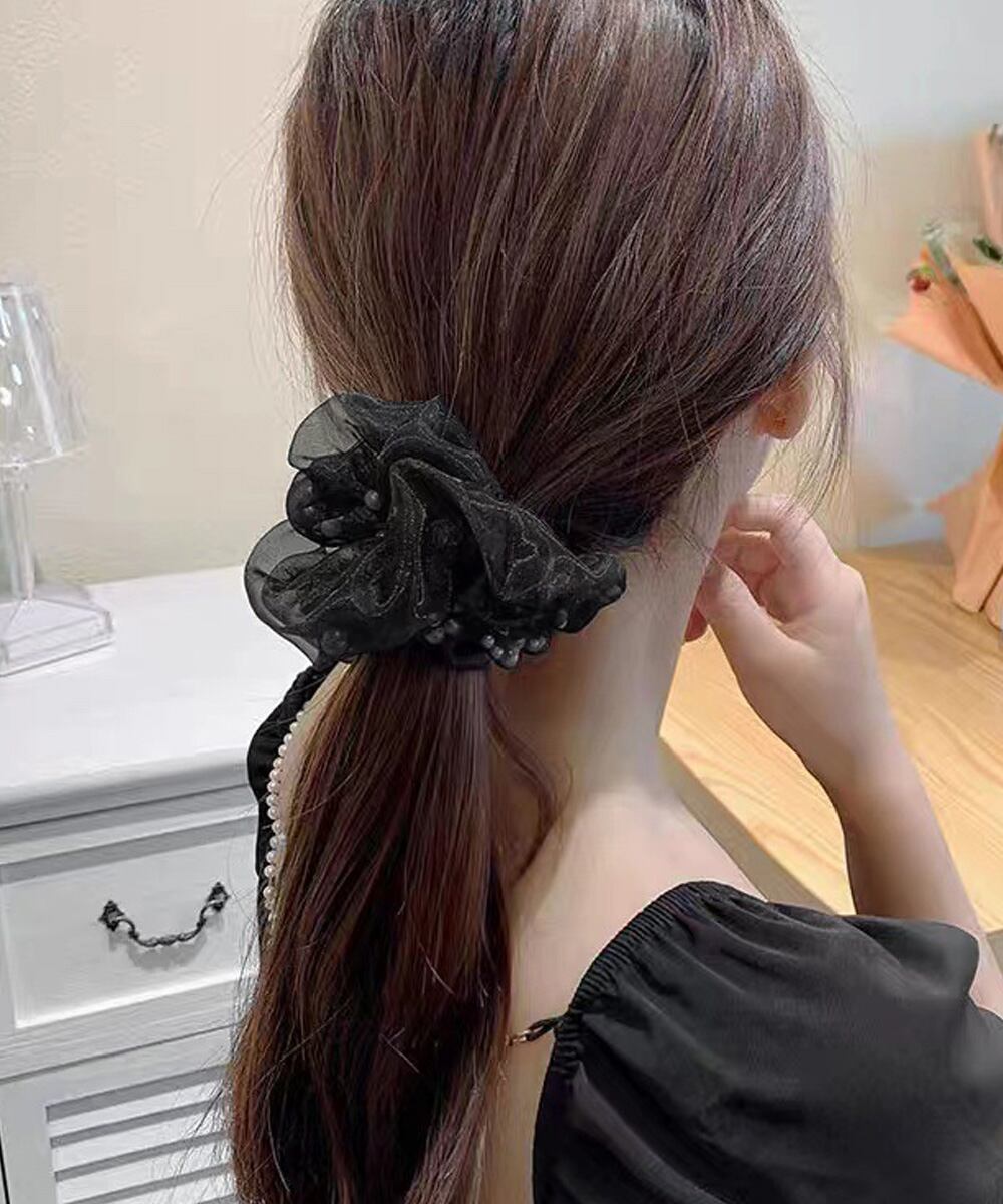 繊細なチュール素材にフェイクパールをあしらった、上品でフェミニンなシュシュ。