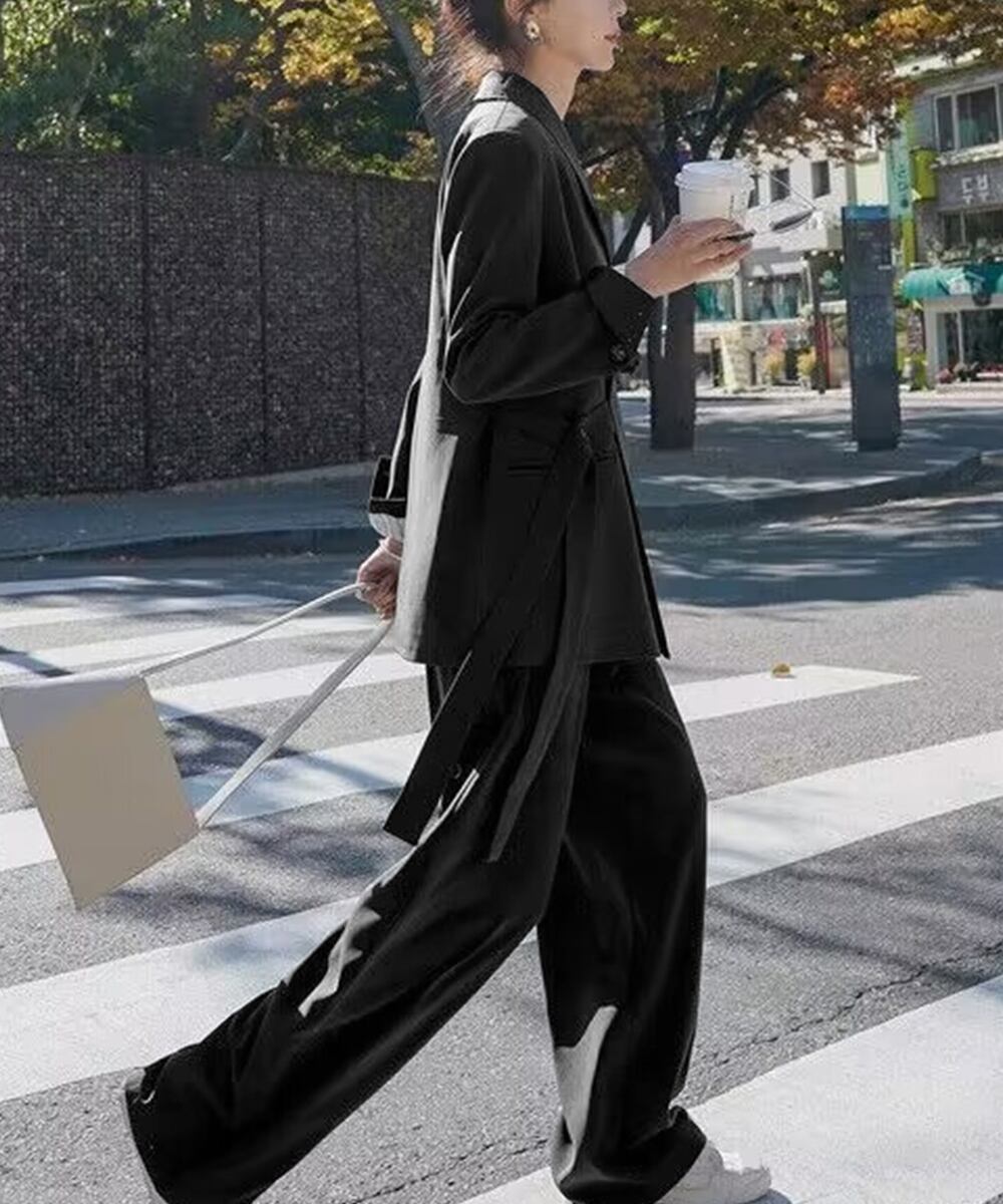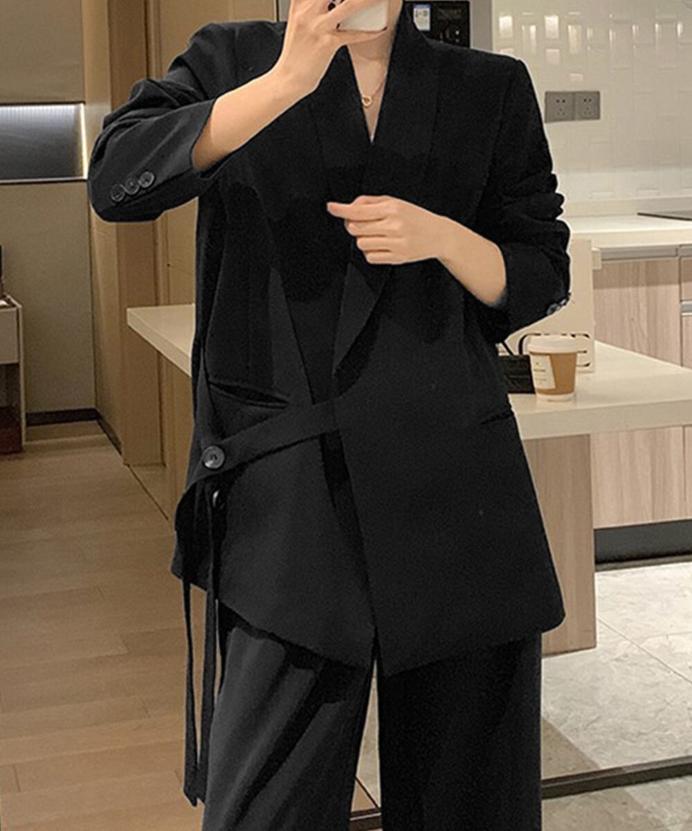 ベルト付きウエストマーク ロングジャケット ゆったり セミワイドパンツ 大人上品セット オフィススーツセット30代40代