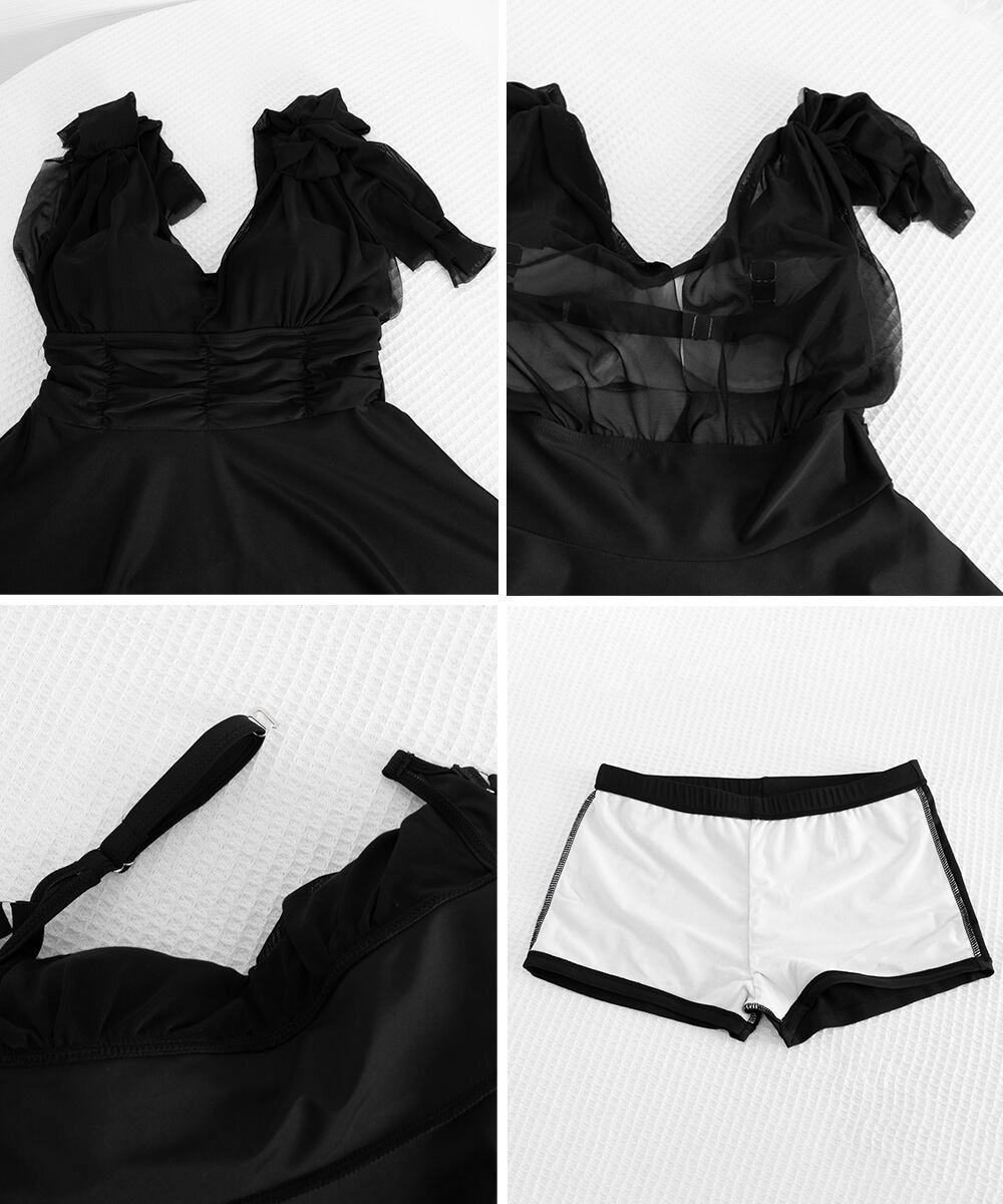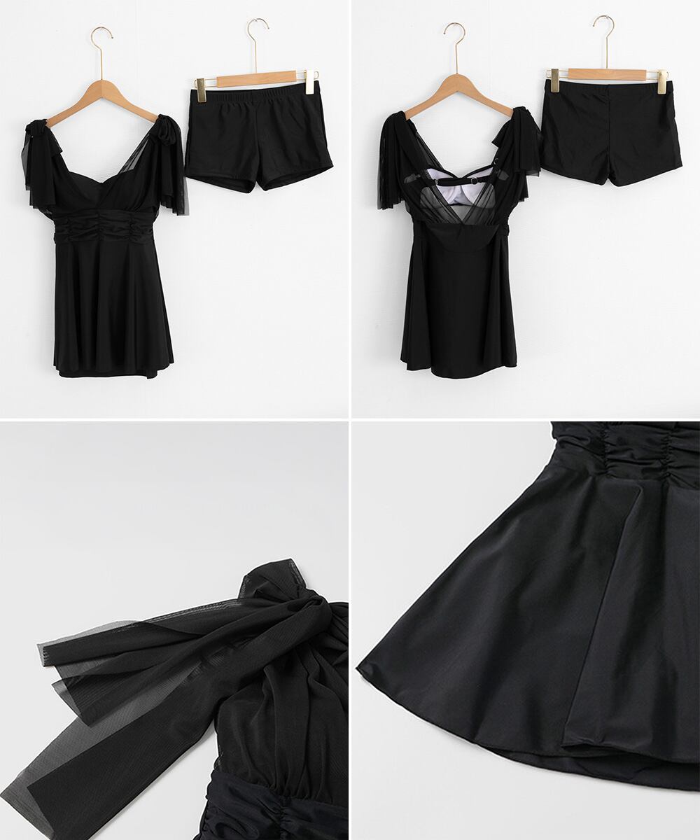 Vネックバスト盛れる水着ショートパンツ付き ショルダーリボン水着セット背中開きフレアワンピ 露出控えめスイムウェア着やせ