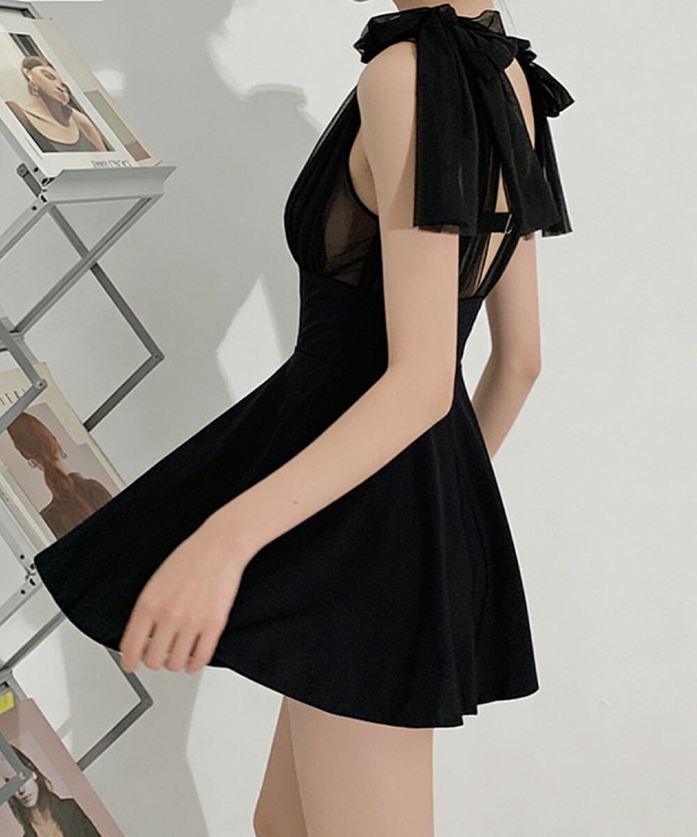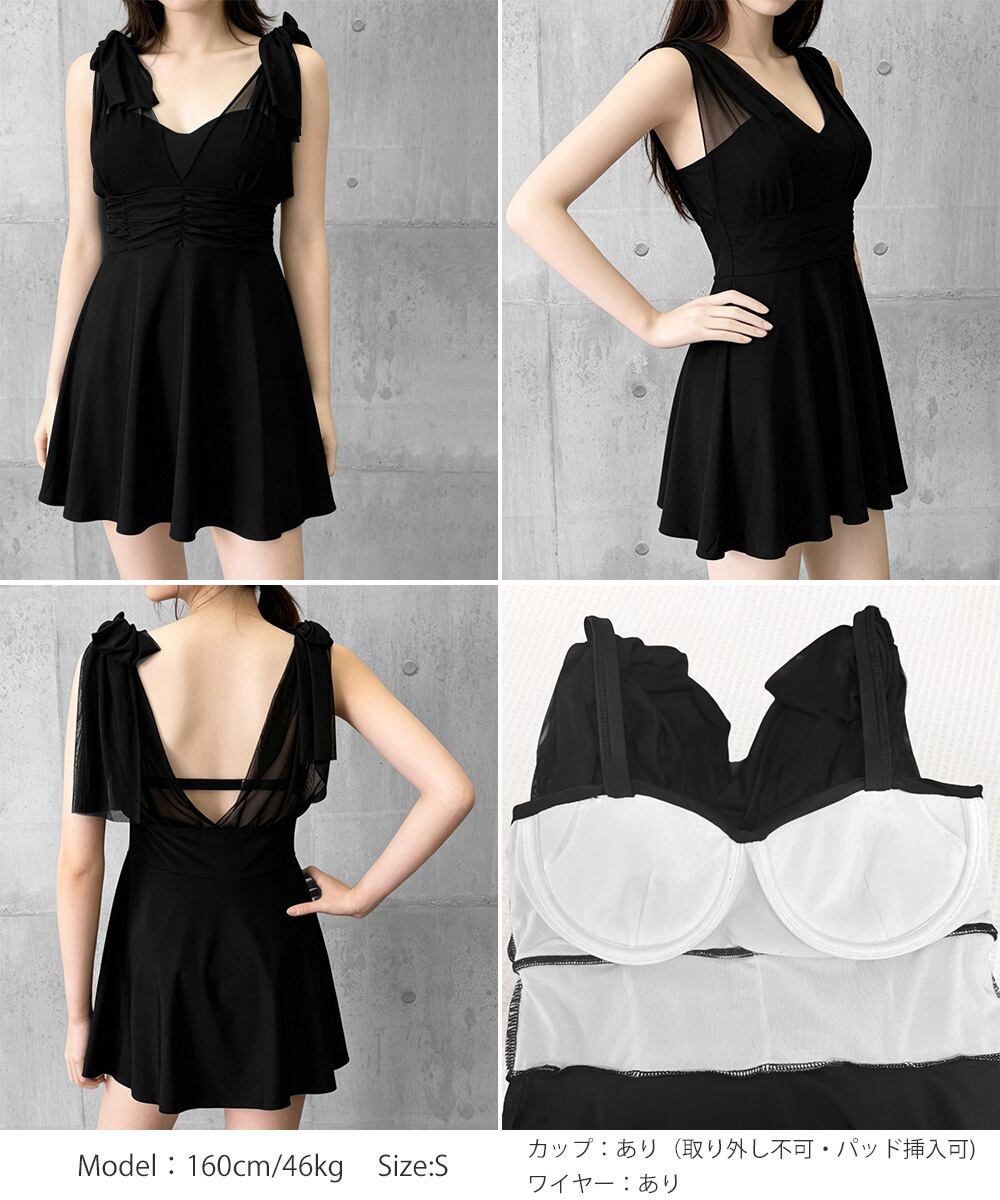 ショルダーリボンとシースルーが目を引く、大人の綺麗めワンピース水着2点セット。