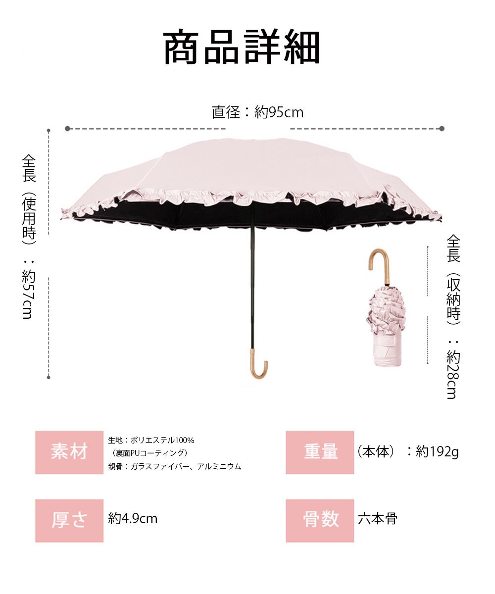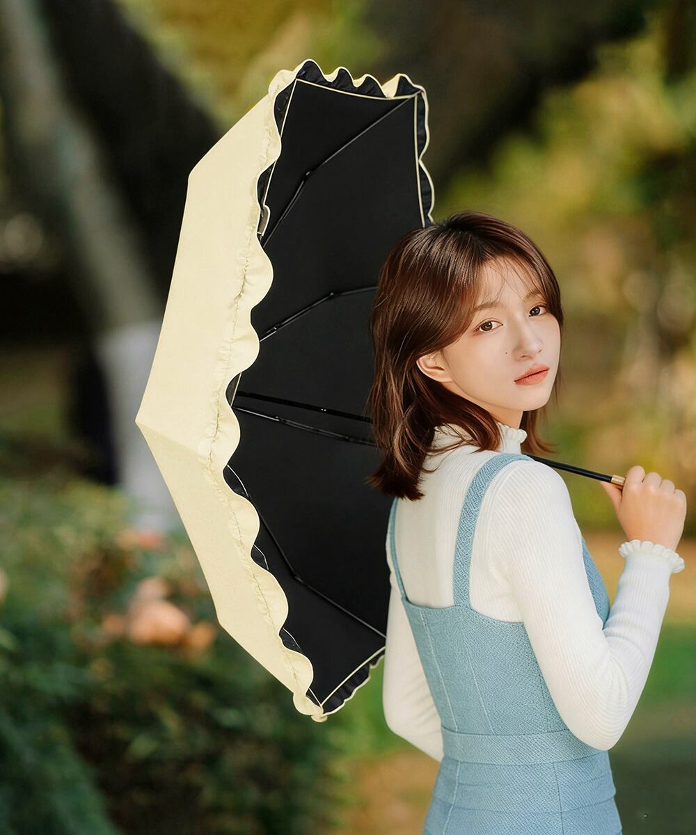 フェミニンフリルミニ雨傘 紫外線対策UV対策3段式雨傘 日焼け防止 ゴールドハンドル遮光傘軽量 携帯便利日傘コンパクト傘