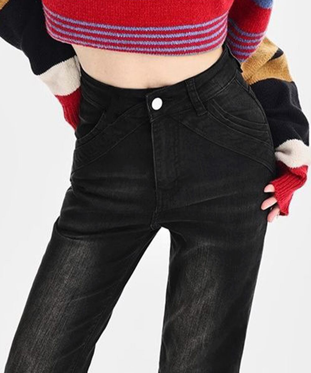 ウエスト部分の斜めにあしらわれた変形ポケットが、シンプルなコーデのアクセントに。