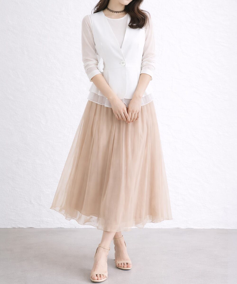 ウエストから広がるフレアシルエットとシフォン切り替えで、女性らしく華やかな印象に仕上がる。