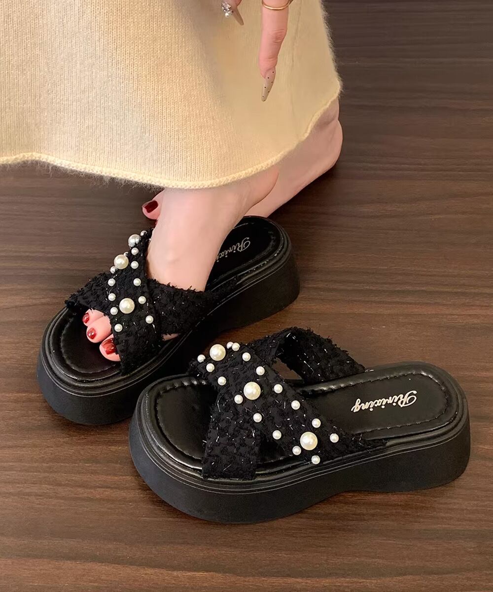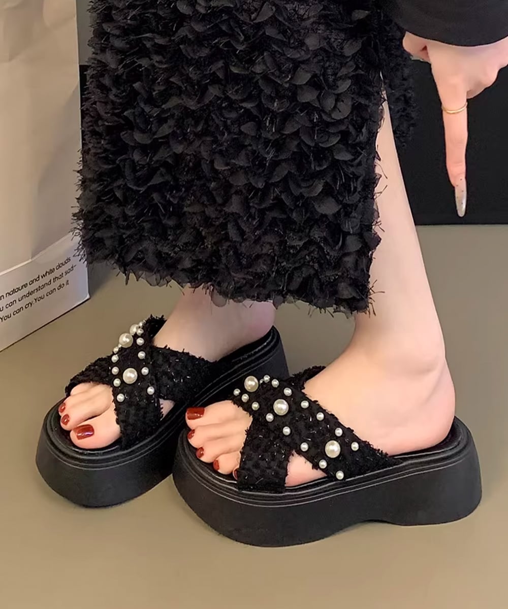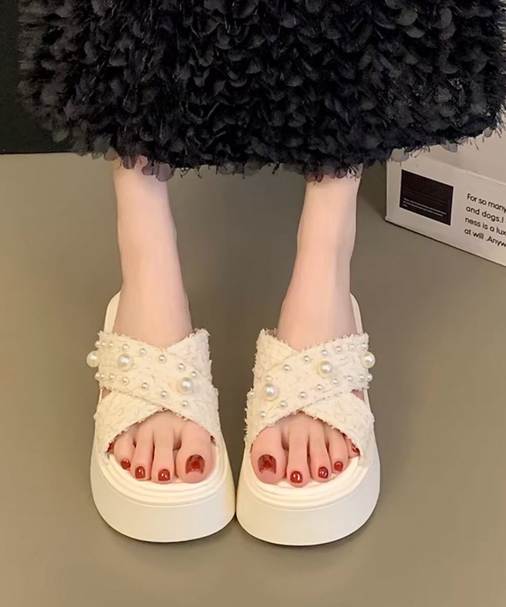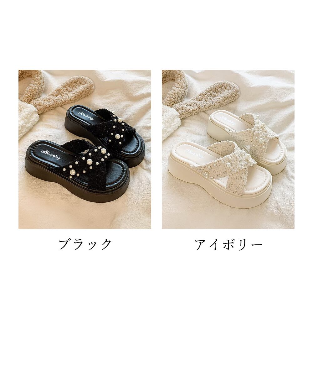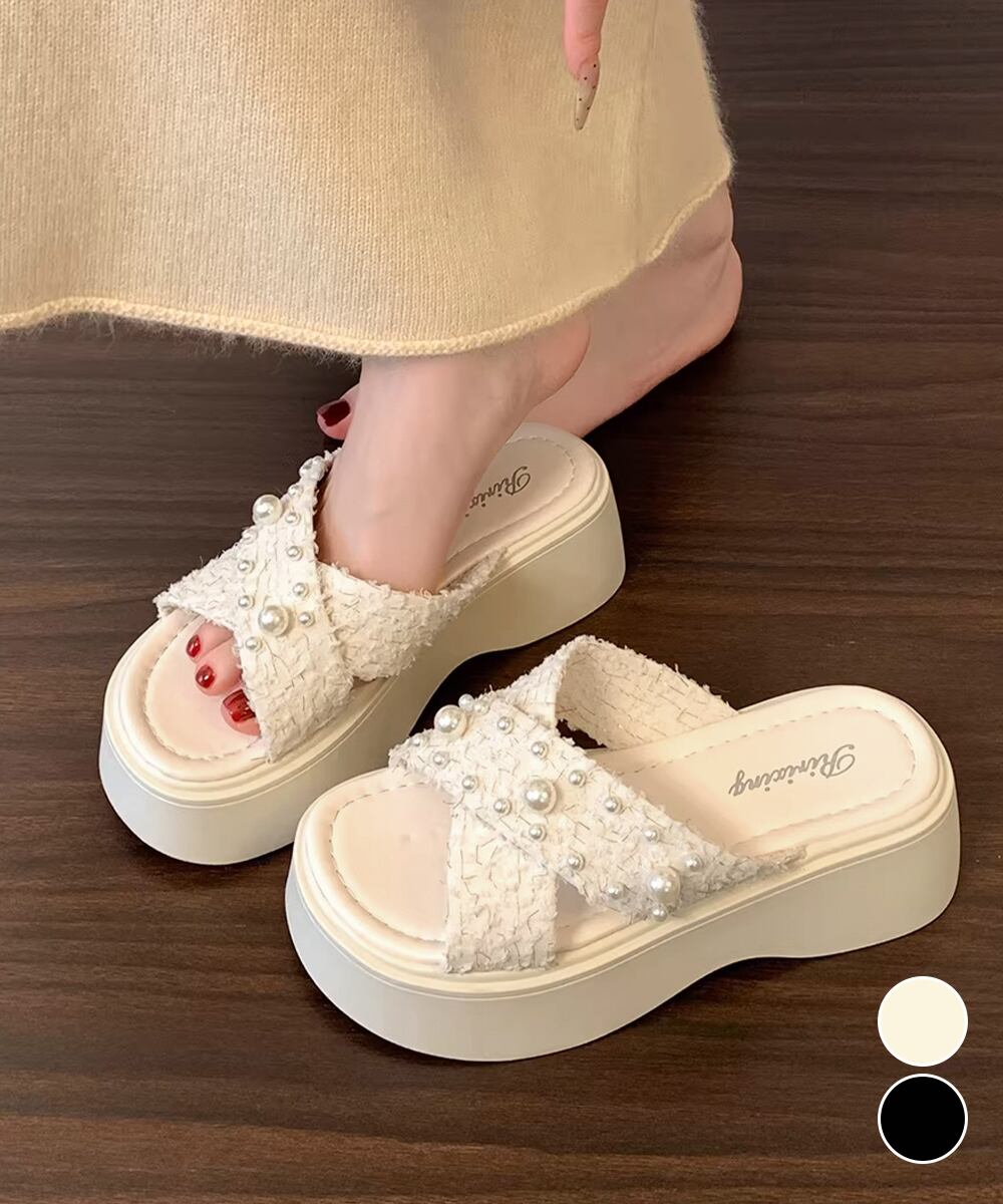 上品なパールディテールが目を惹く、大人かわいい厚底サンダル。