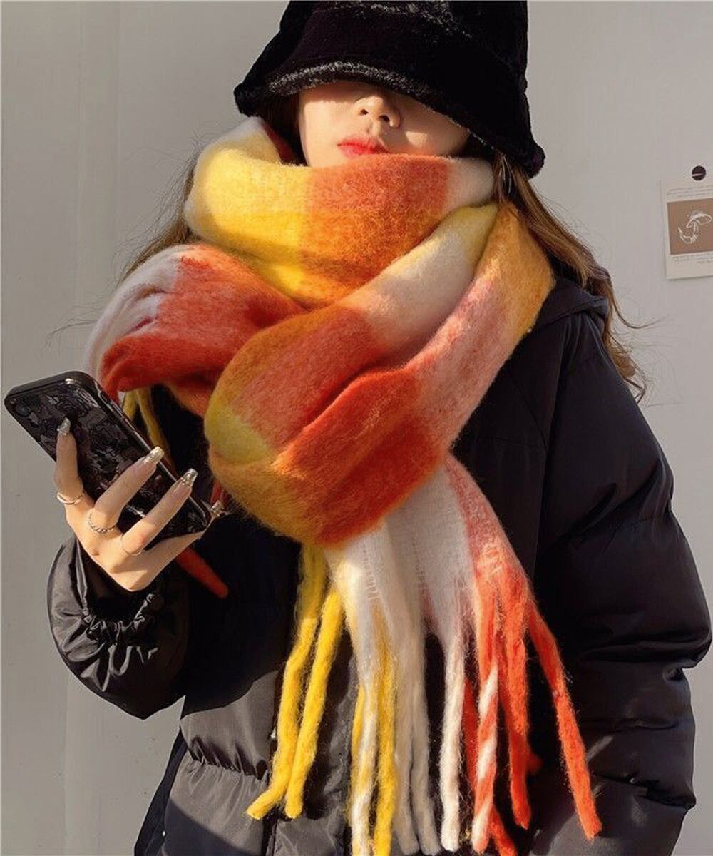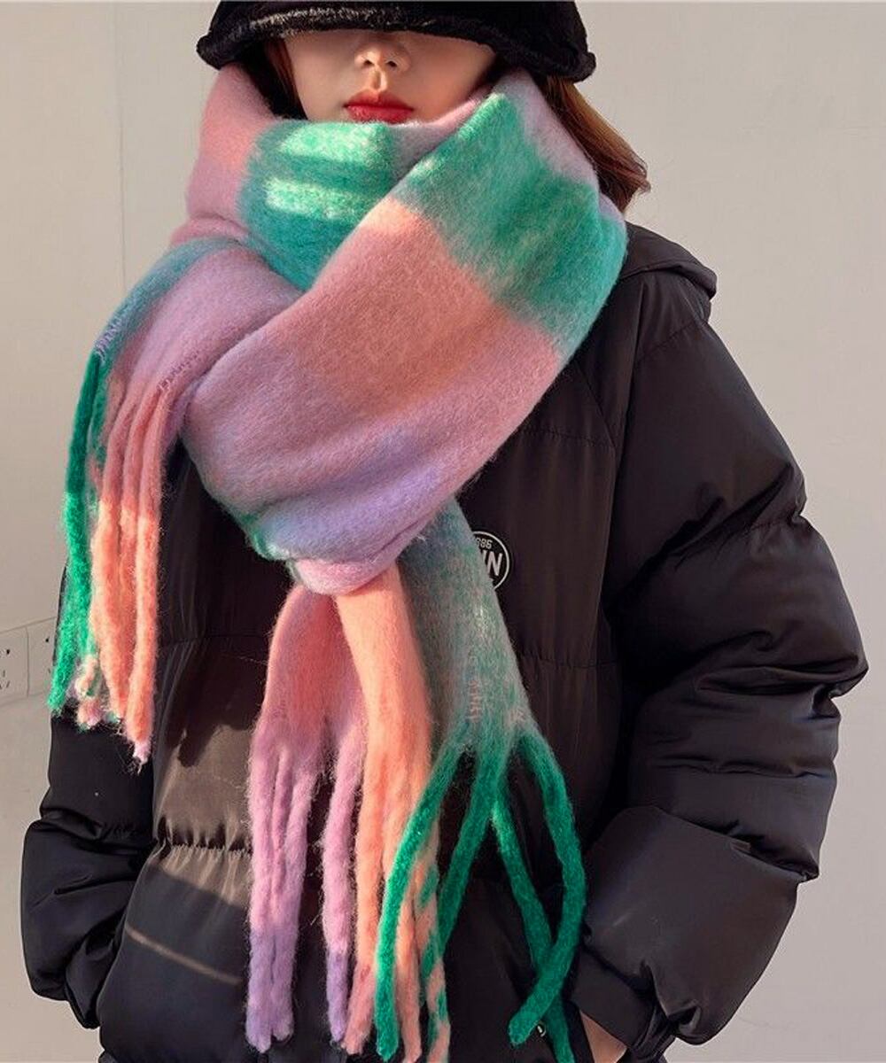 韓国ボリューム フリンジマフラー レインボーマフラー 秋冬暖かいニットマフラー リバーシブル スカーフショール 防寒防風