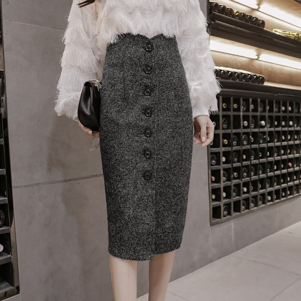 フロントボタン全開式のハイウエストミモレ丈ツイードスカート