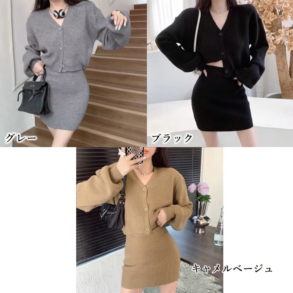 ニットアンサンブル リブ編みニットカーディガン ショート丈 Vネックトップス 長袖 ニットスカート ミニスカートセクシー
