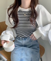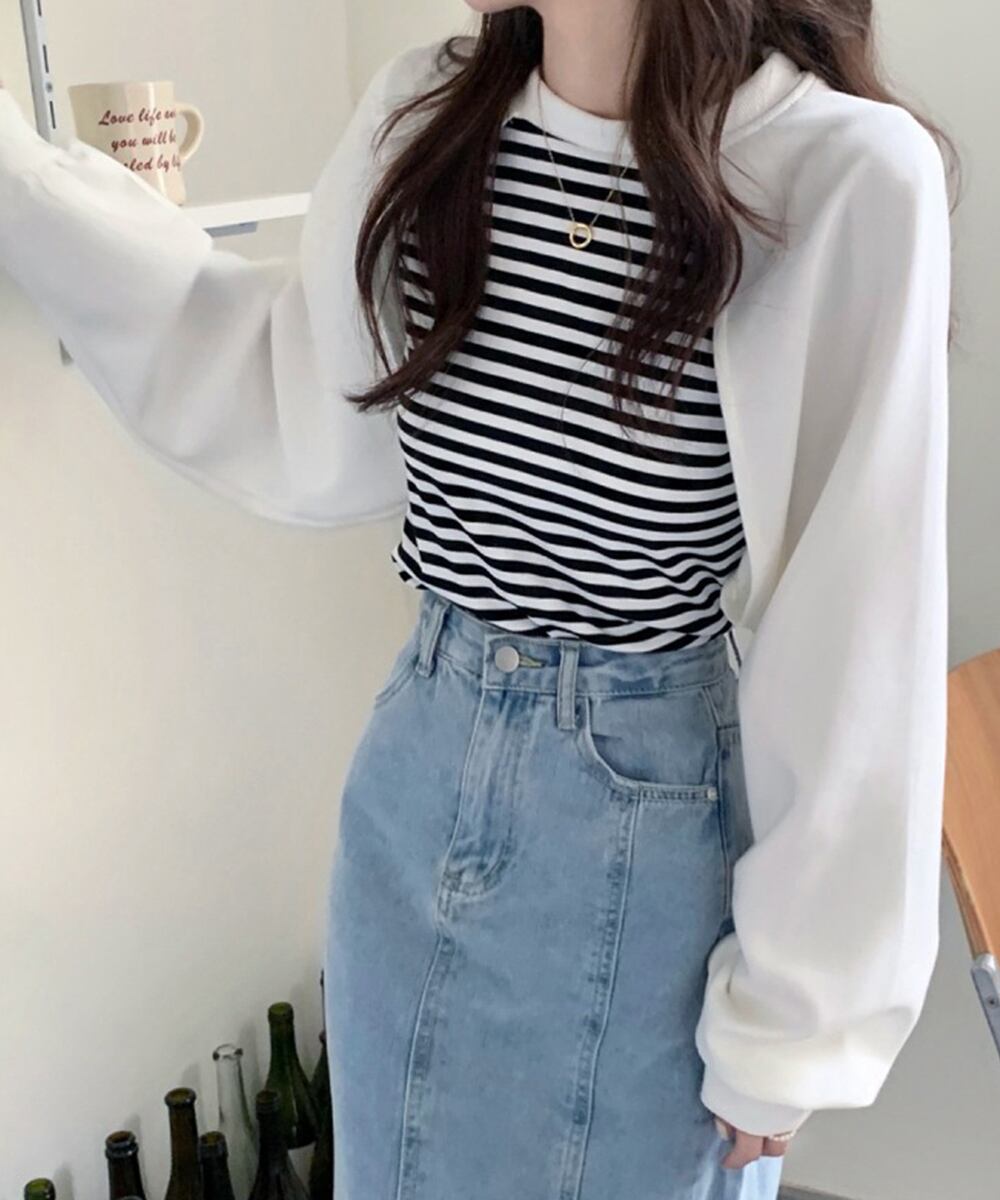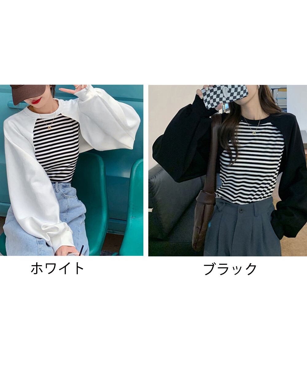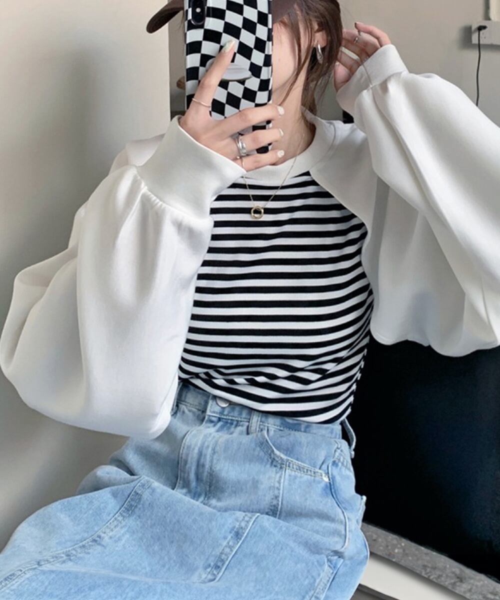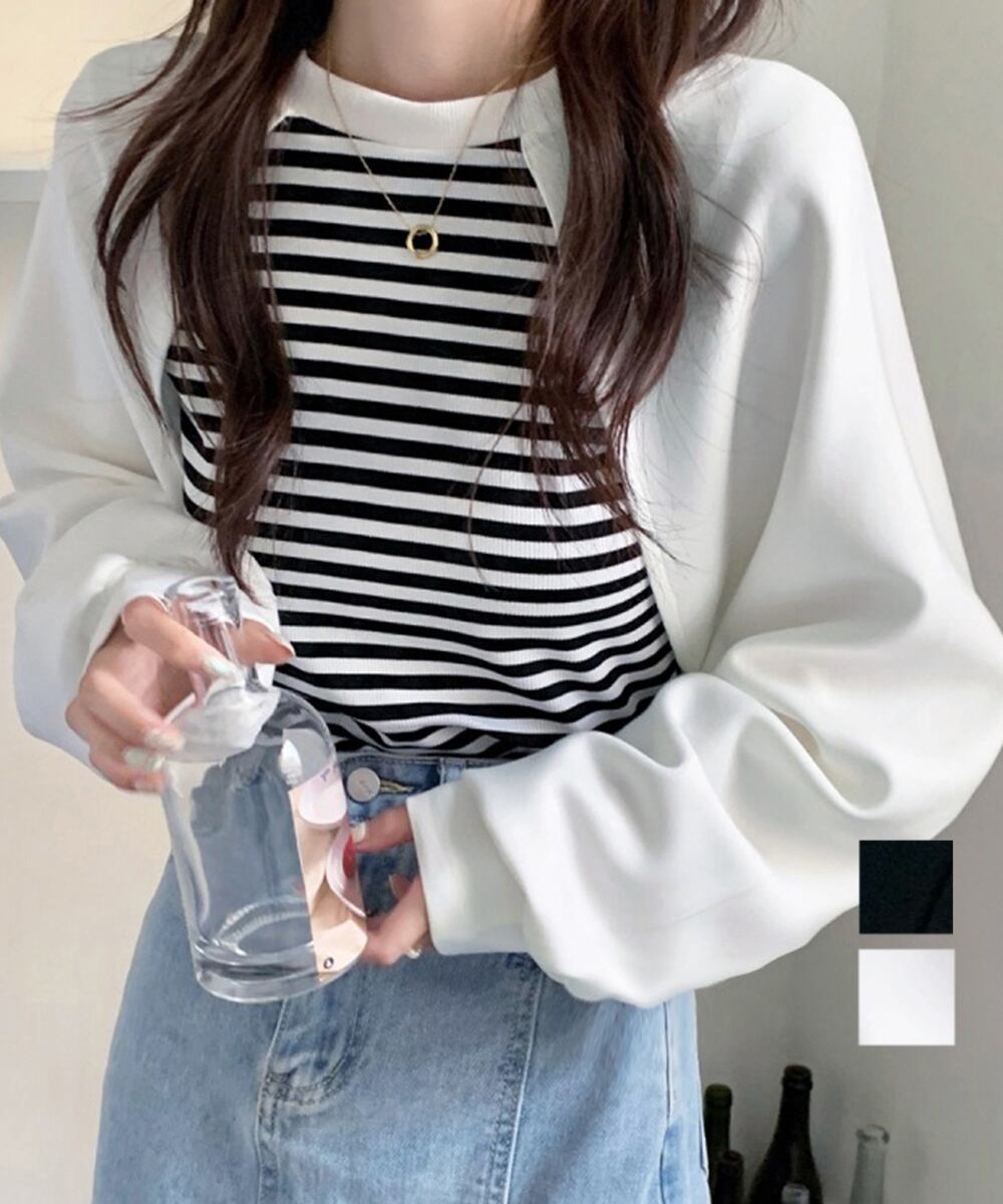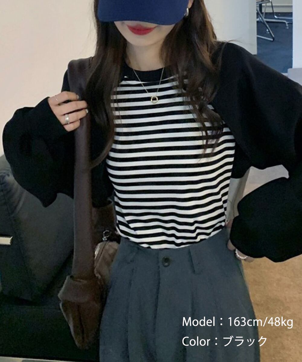 レディーストップス レイヤード風 スウェット ボーダー柄 ボリューム袖 着やせ ラウンドネック カジュアル おしゃれ