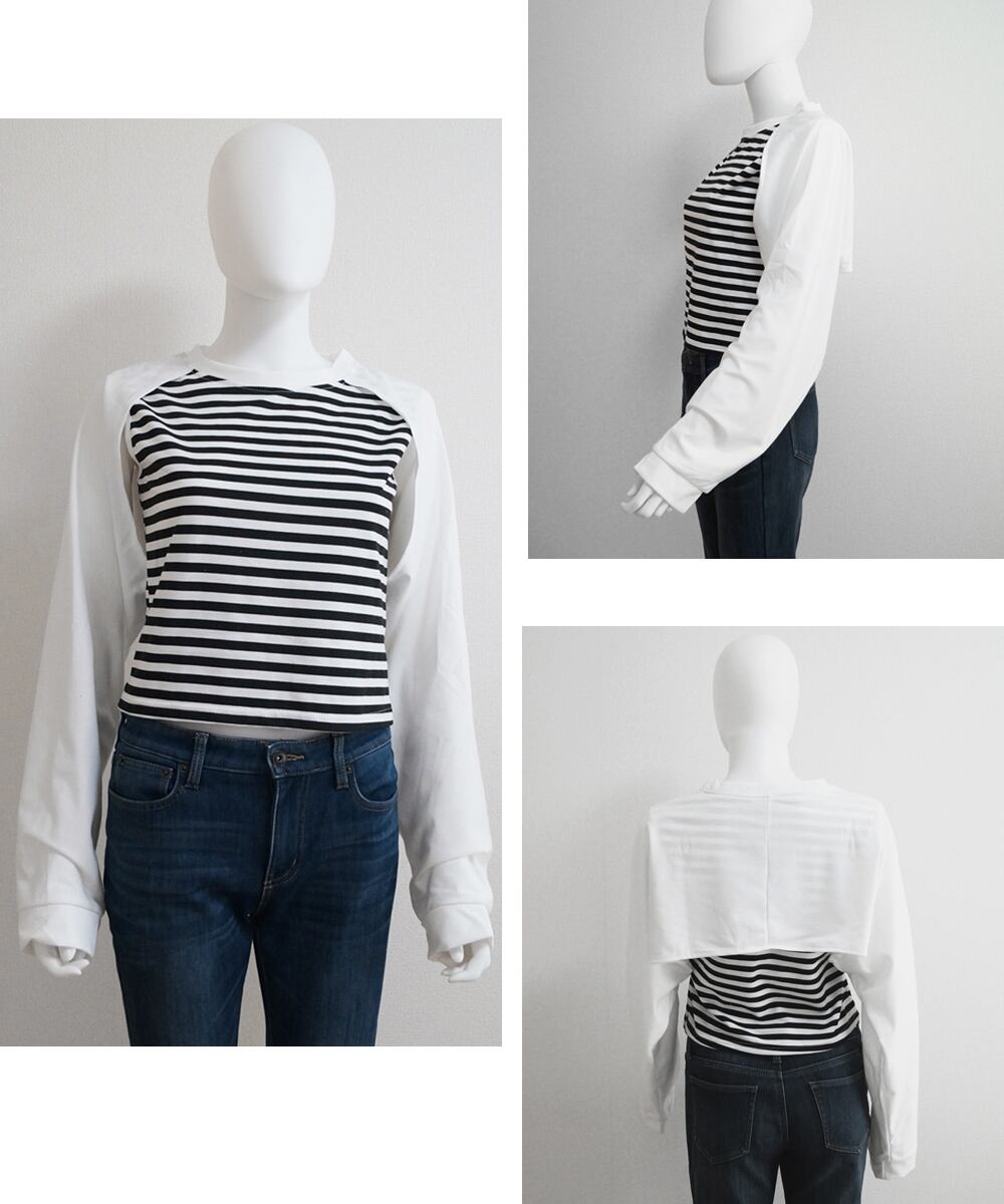 タンクトップと長袖がドッキングしたレイヤード風トップス。