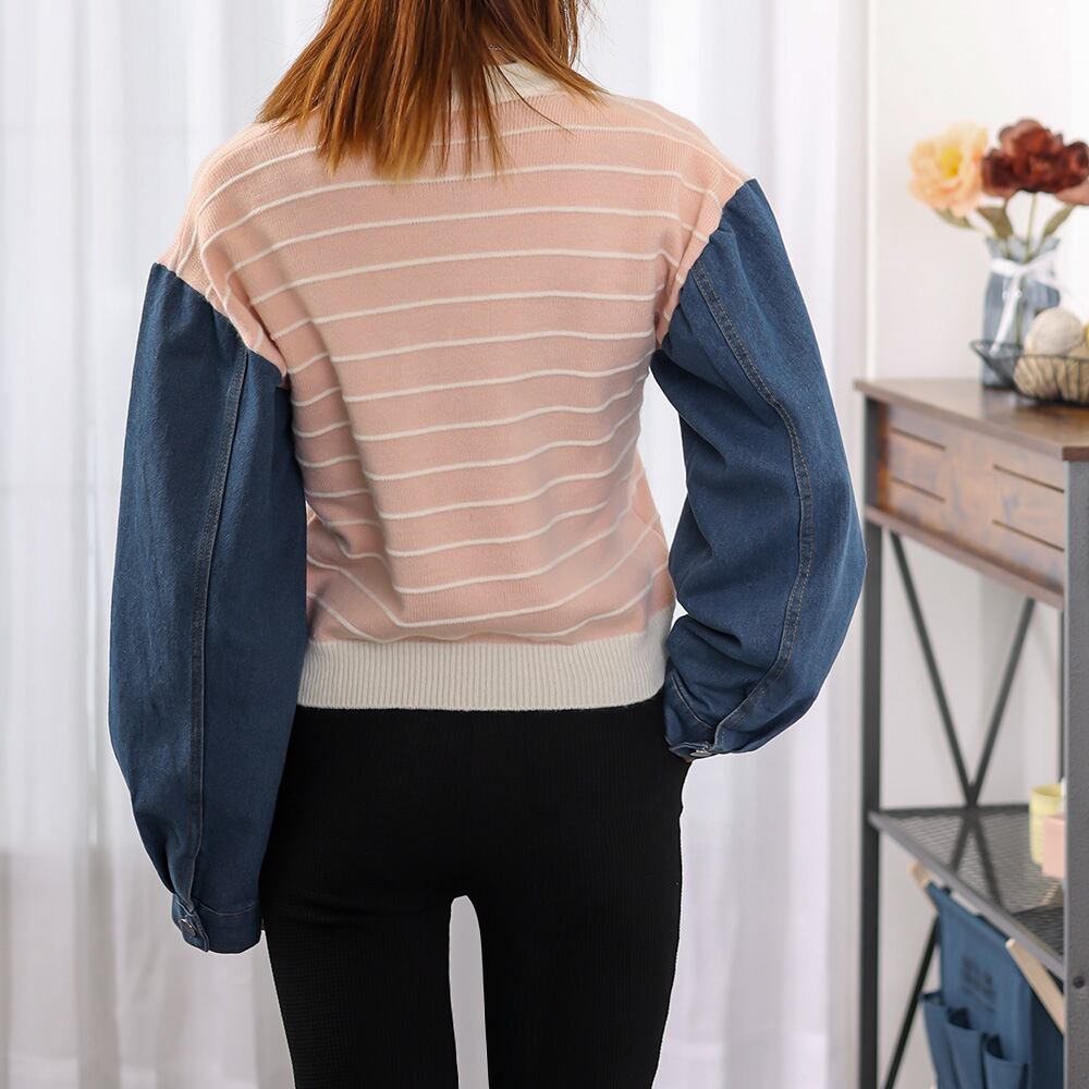 ボーダーニット デニムシャツ切り替え ドッキングトップス 長袖 カジュアルきれいめ 重ね着風 ニットプルオーバー お洒落