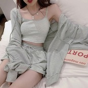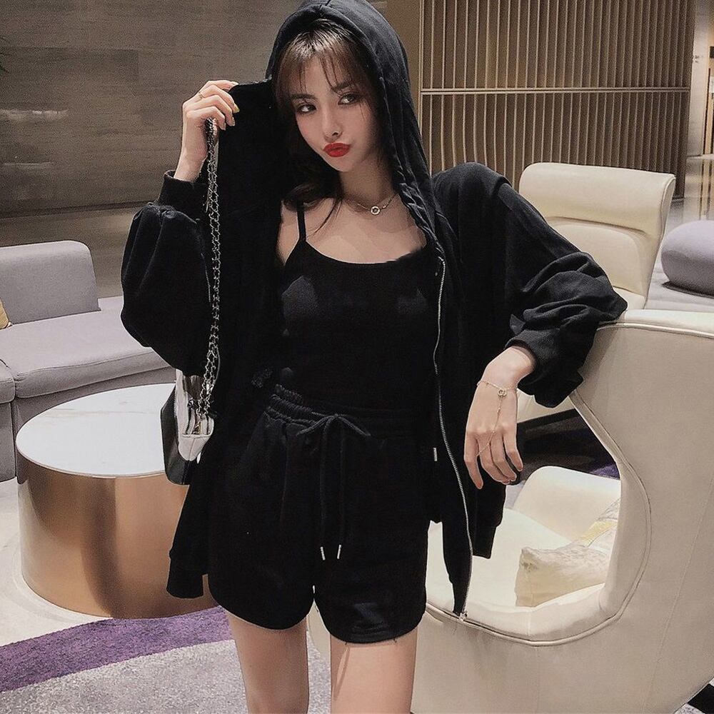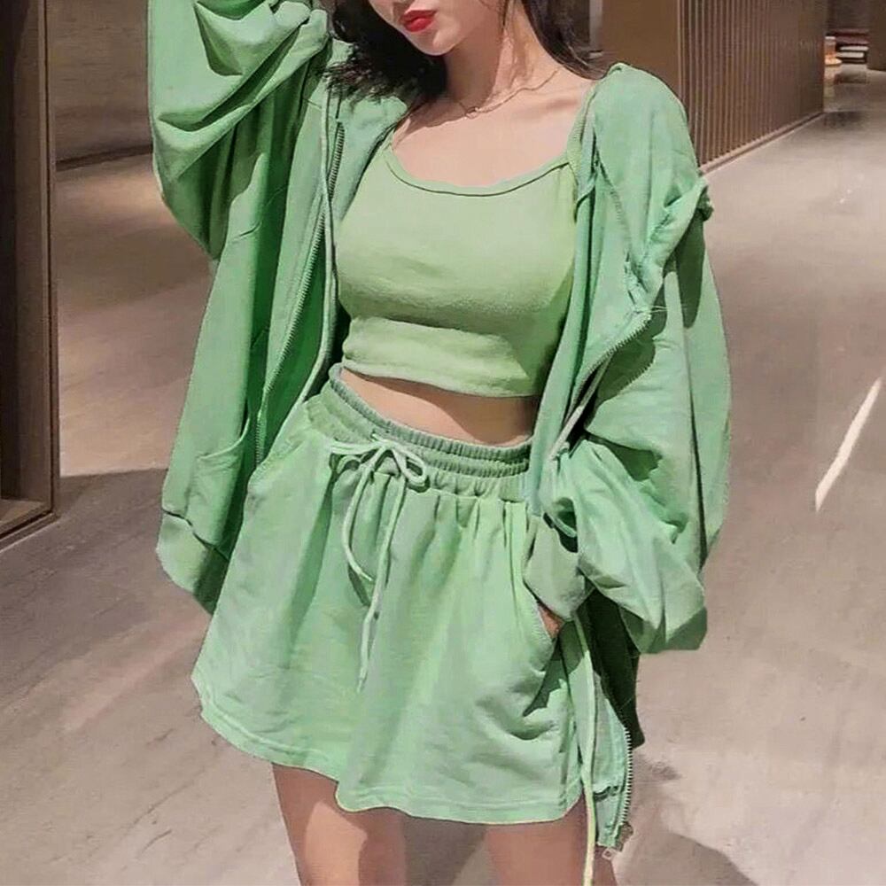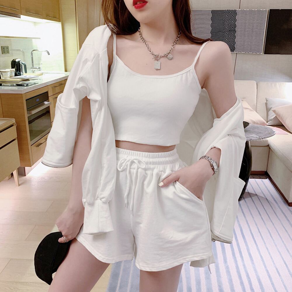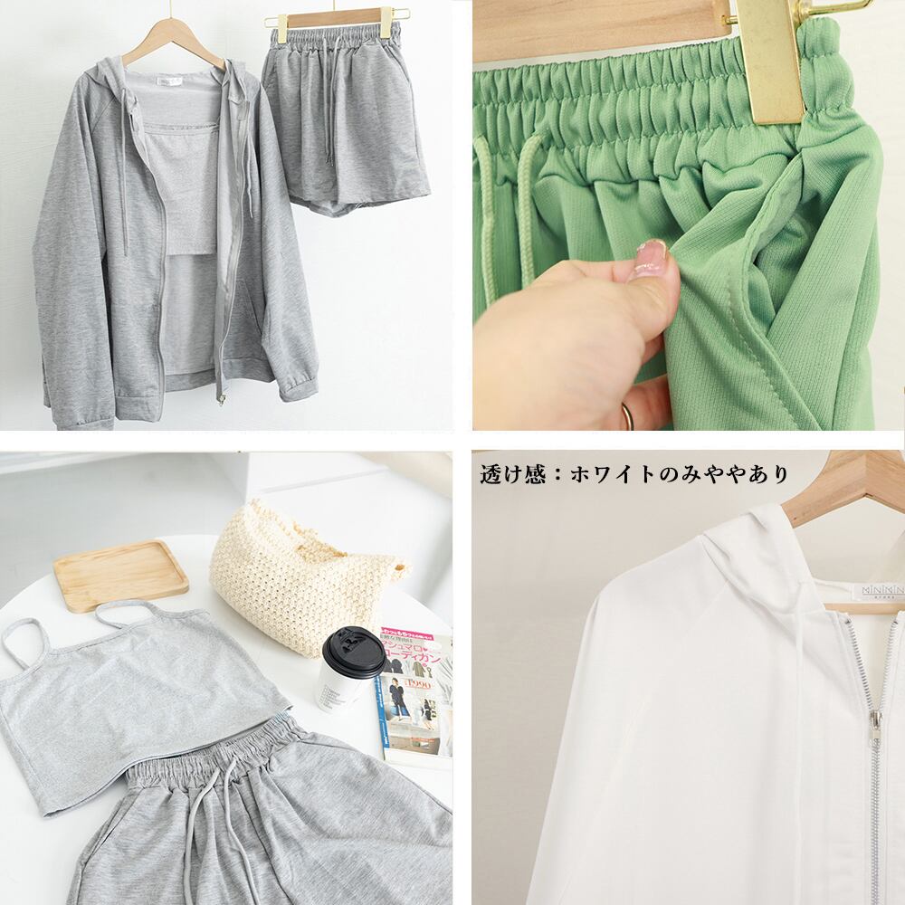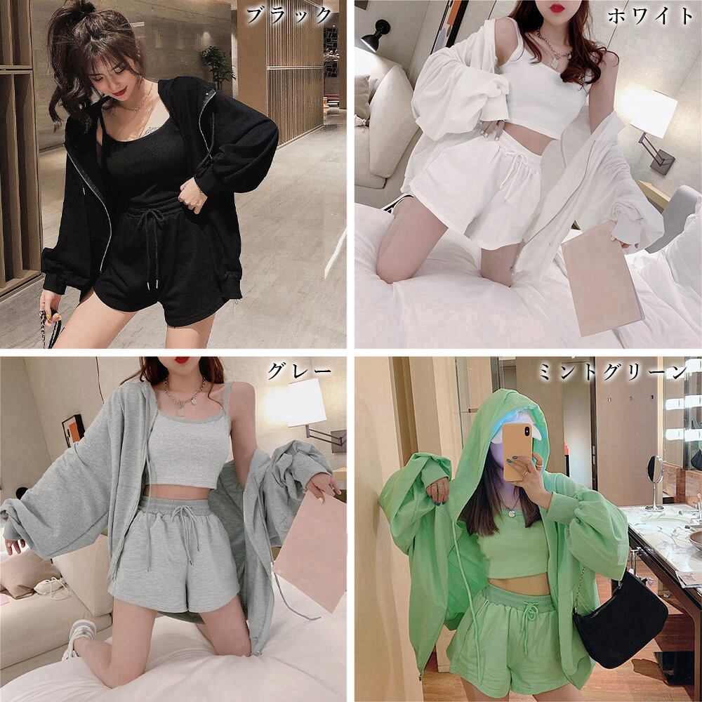 可愛い 部屋着セット 長袖 ルームウェア カジュアル ジップアップパーカー ショート丈キャミソール ショートパンツ 春夏