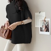 韓国 フレンチスリーブニット スリット リブニットポンチョ 重ね着 大人カジュアル ニットセーター プチハイネックベスト
