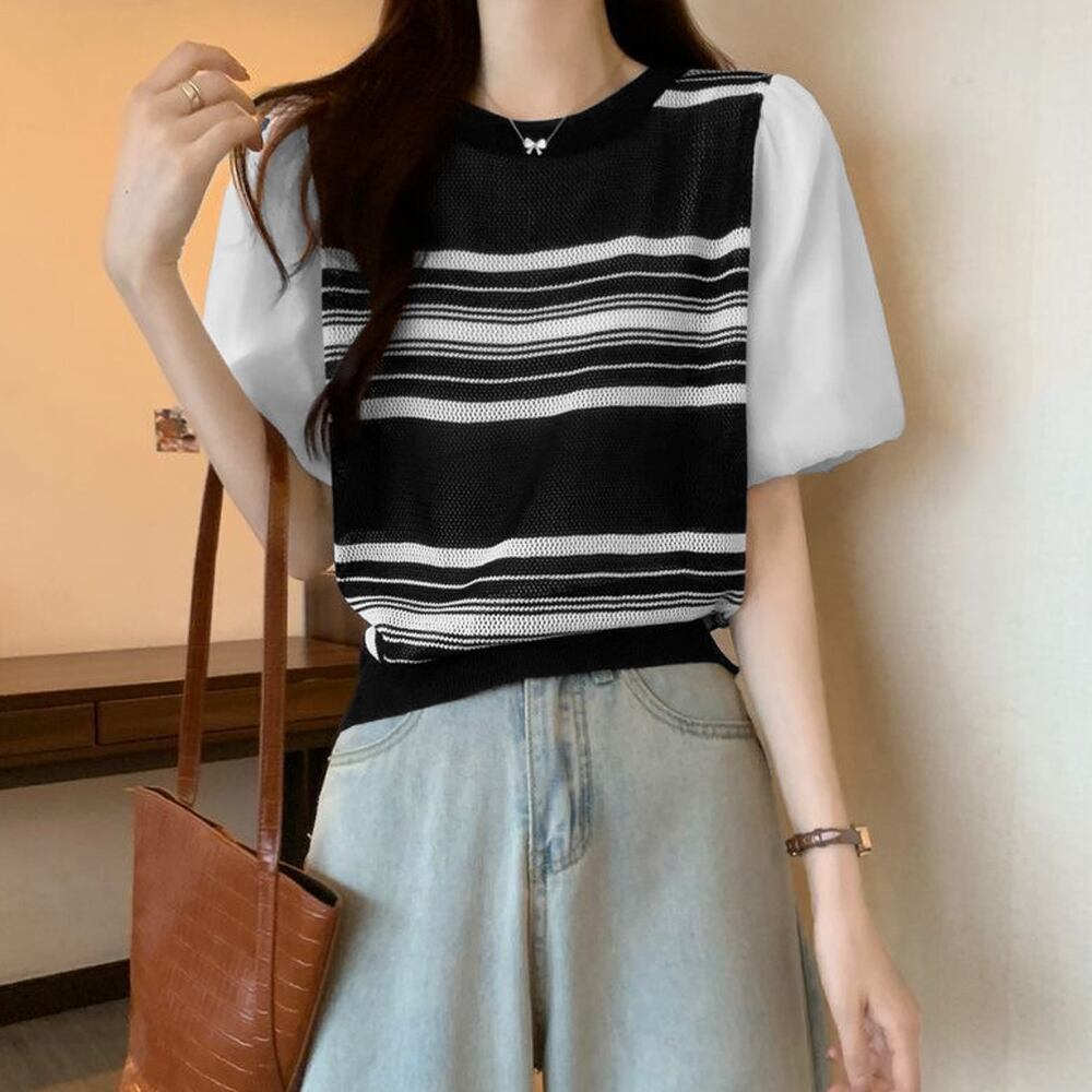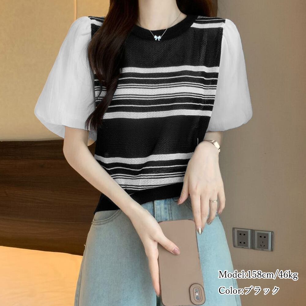 レディース パフスリーブ 透かし編みニット 大人可愛い ドッキングニット こなれ感 薄手 韓国 着やせニットブラウス