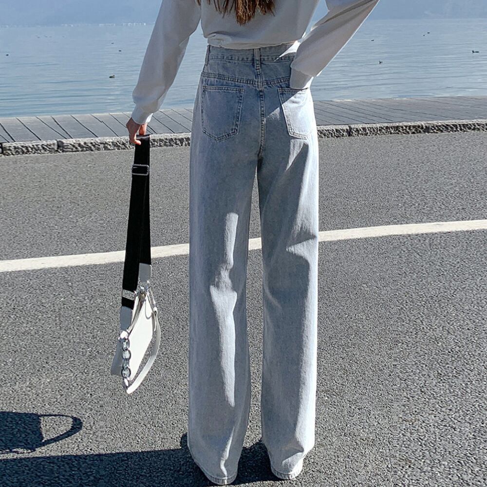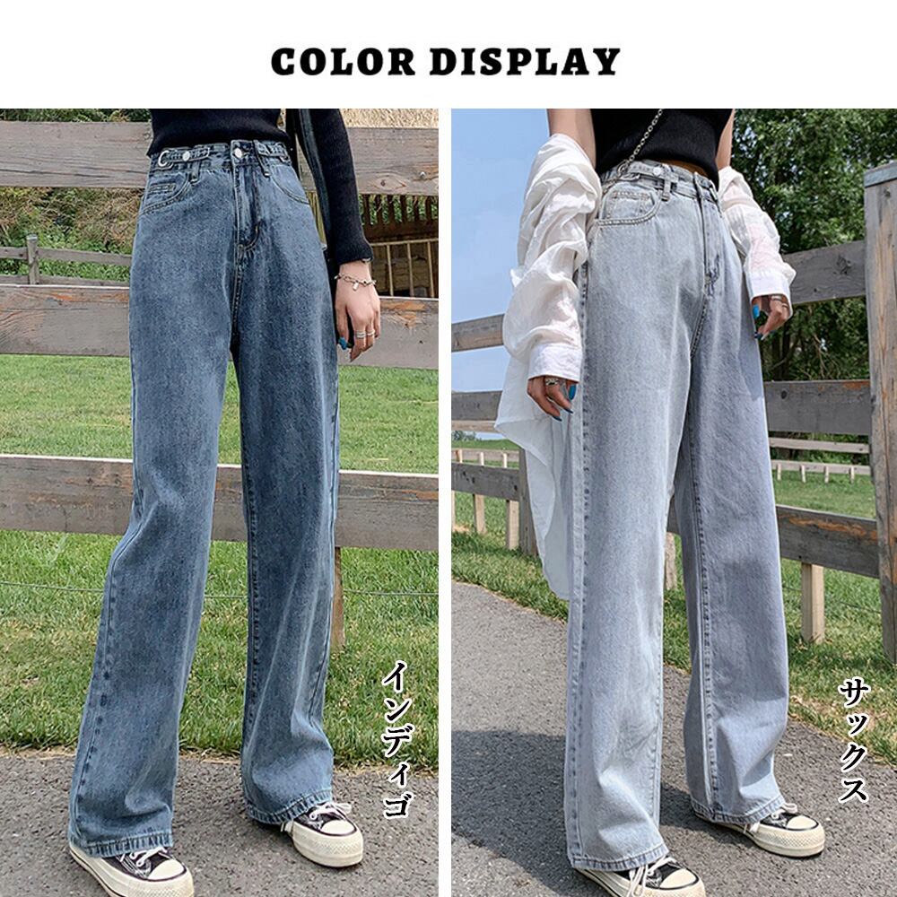 ハイウエスト セミワイドデニムパンツ 脚長見せ ロングパンツ ゆったり 着やせ ボトムス 韓国風 オルチャン定番デニム