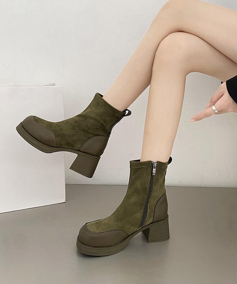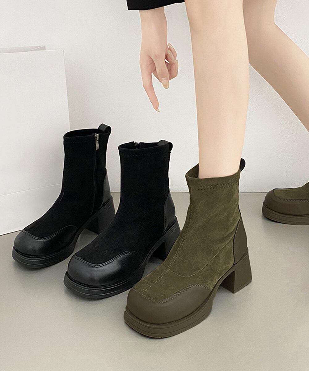 5.5cm太ヒール スクエアトゥ 美脚ブーツ 歩きやすい 履きやすい おしゃれ 大人カッコイイ カジュアル オルチャン