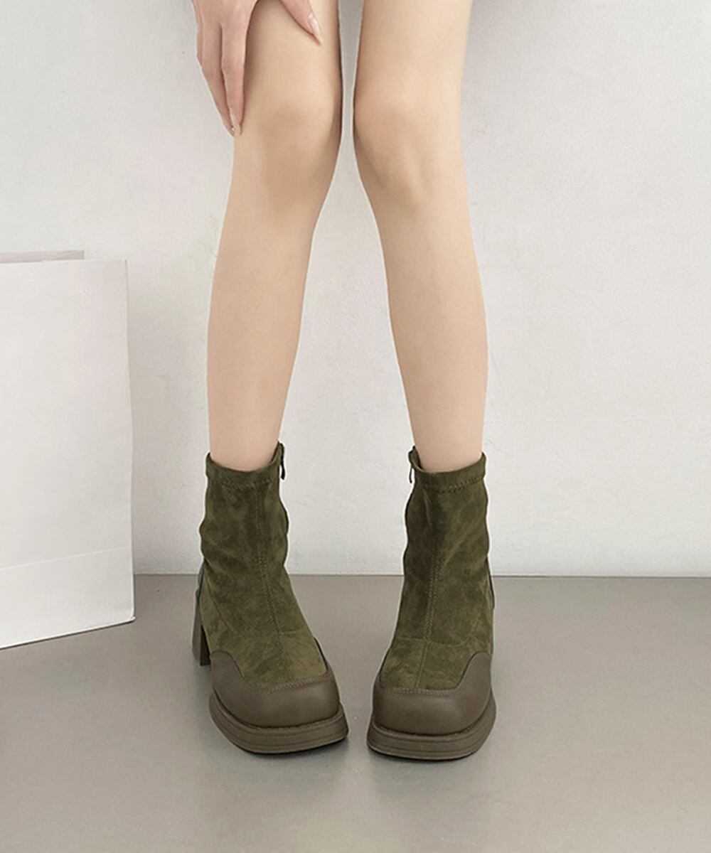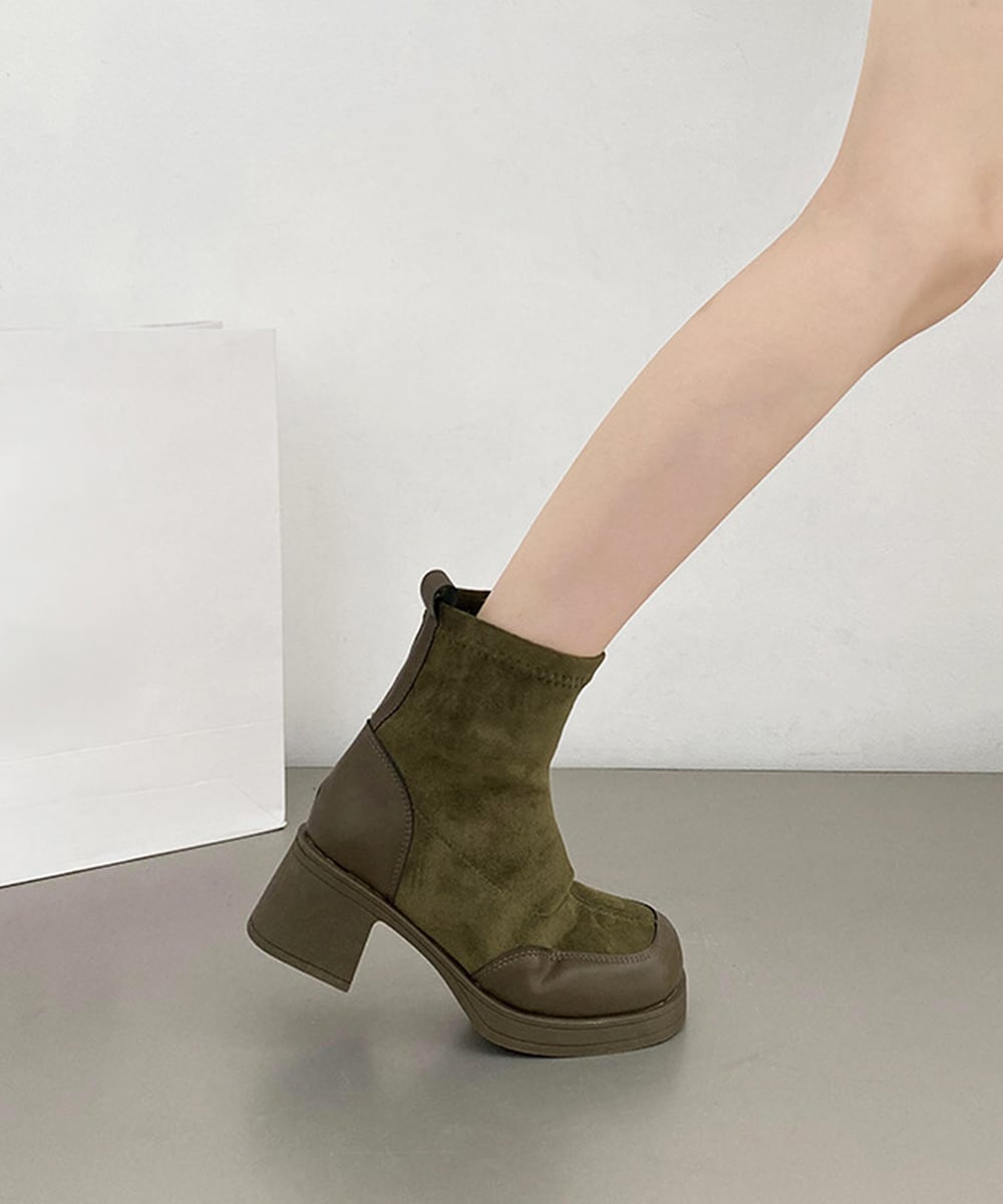 カーキとブラック2色展開の厚底ショートブーツ。