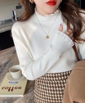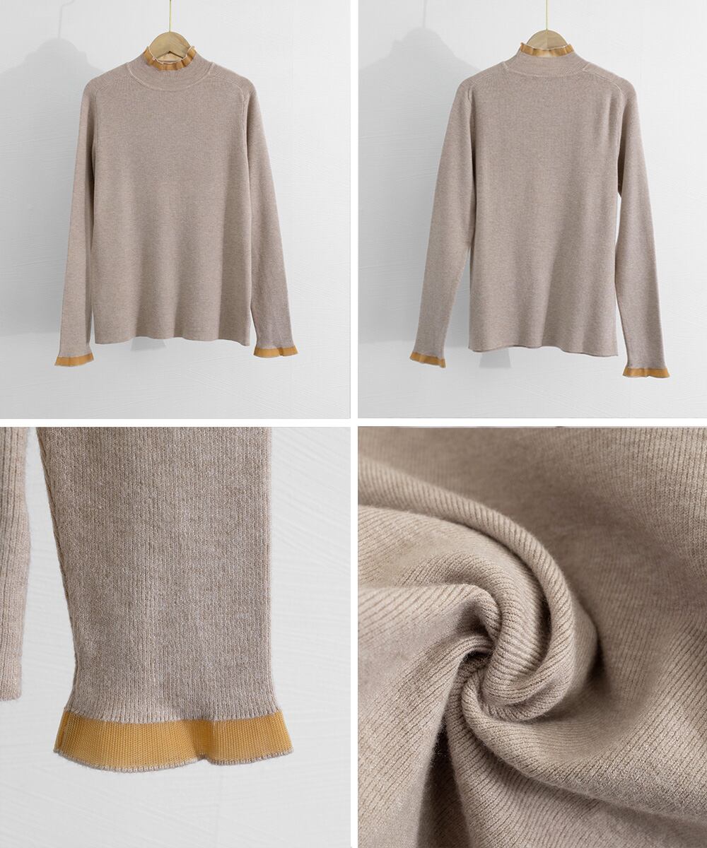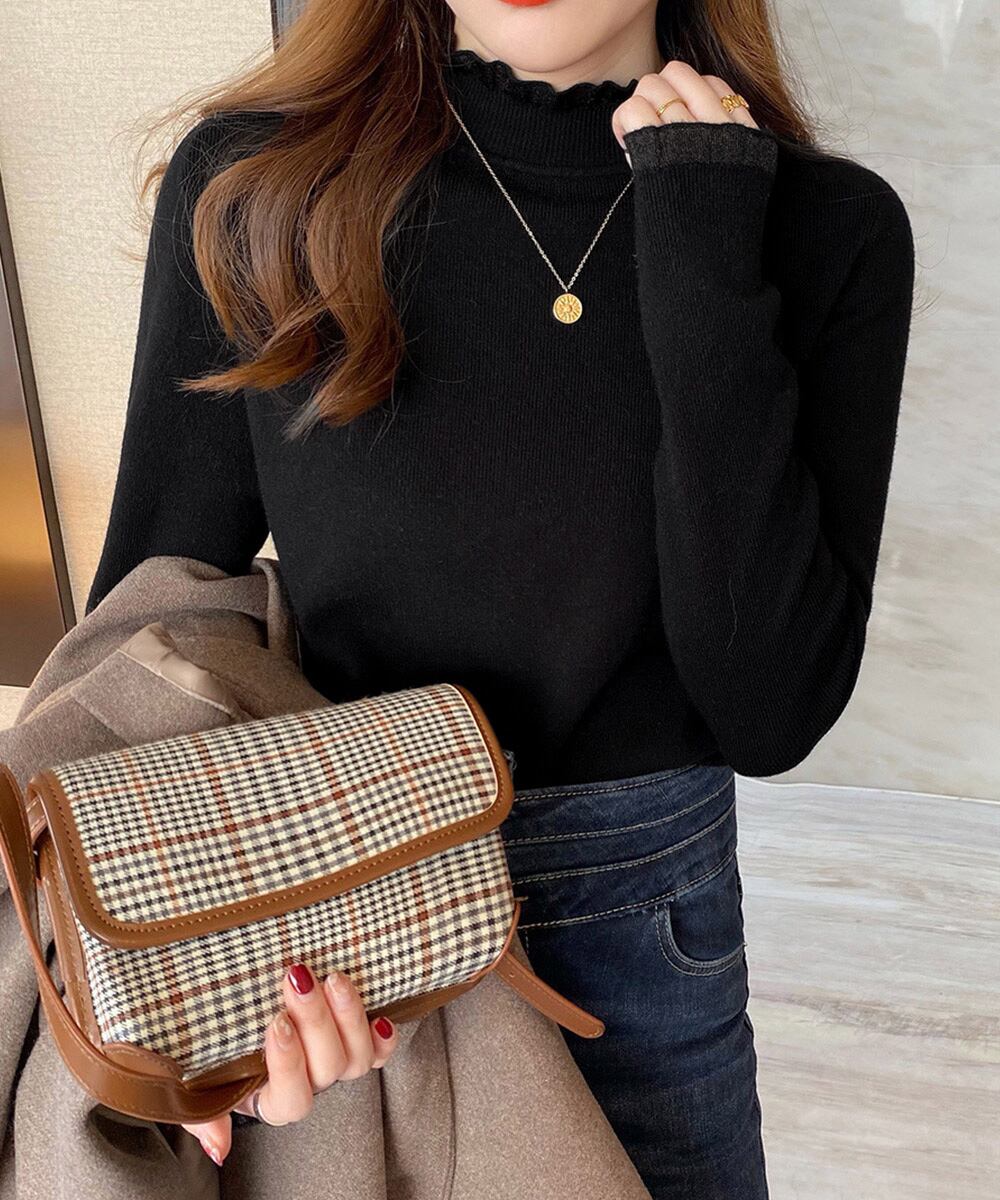 細リブで縦にすっきり、襟と袖口に施されたメロウフリルが大人可愛いハイネックニットトップス