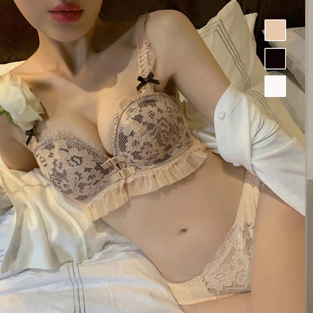 花柄刺しゅうレースランジェリーセット 肩リボン 胸元セクシー ブラジャー ショーツフェミニン 大人美胸 盛りブラ フリル
