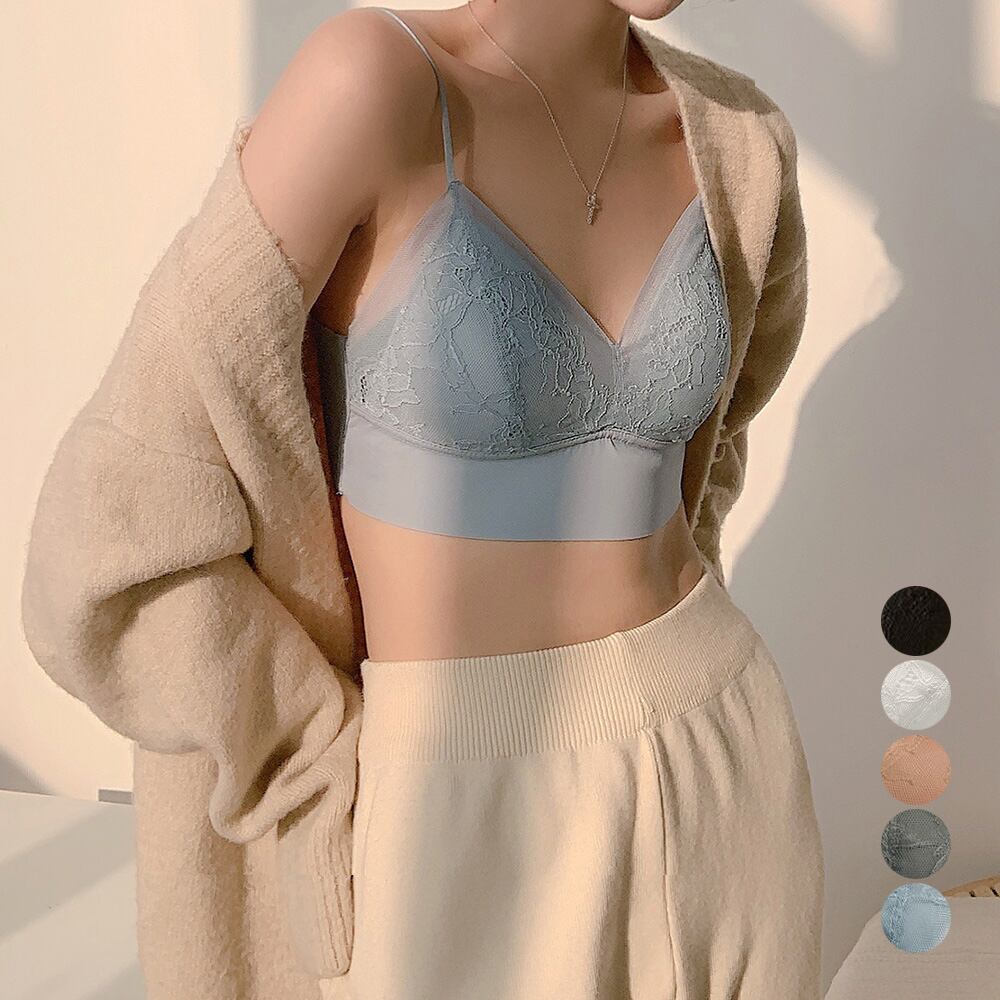レースブラジャー ノンワイヤー単品ブラ 大人女性 ワイヤレス キャミブラ 快適インナー Vネック 美胸ランジェリー 春