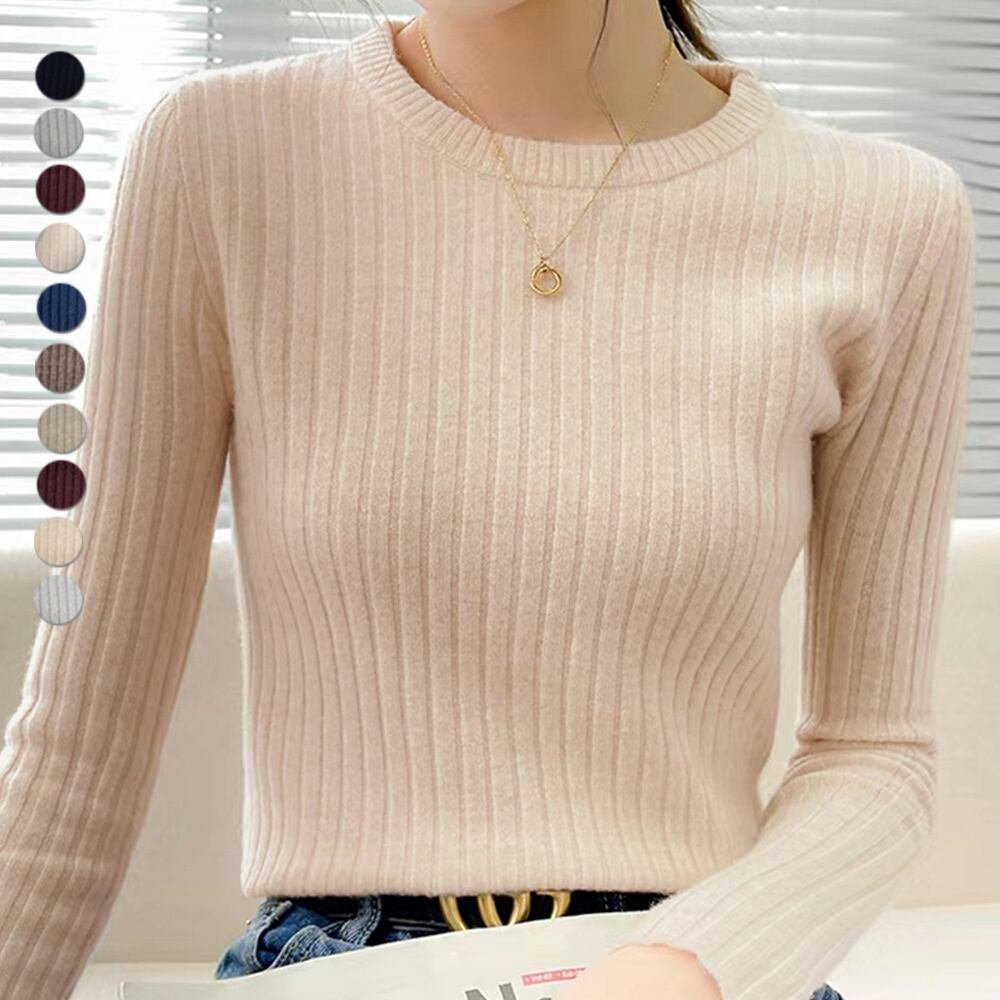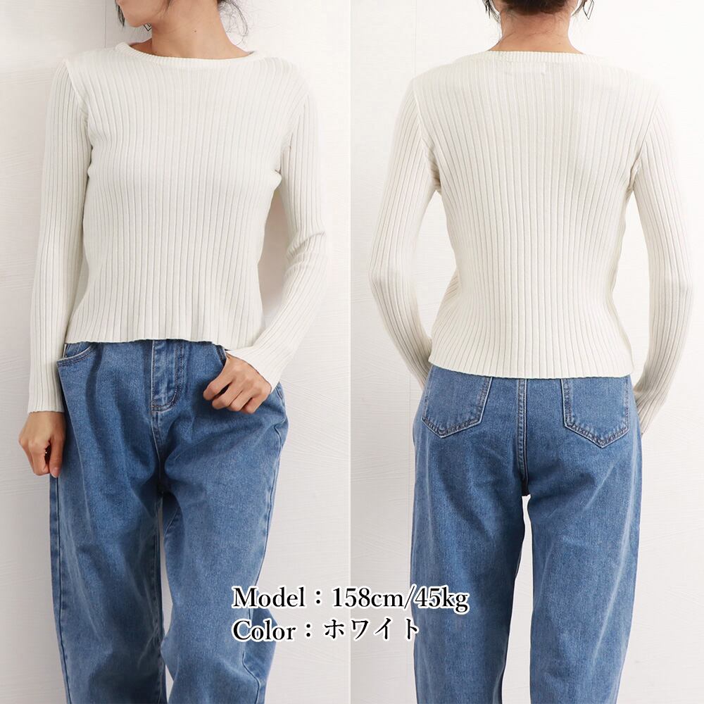 すっきり見えるリブ編みデザインの長袖ニットトップス