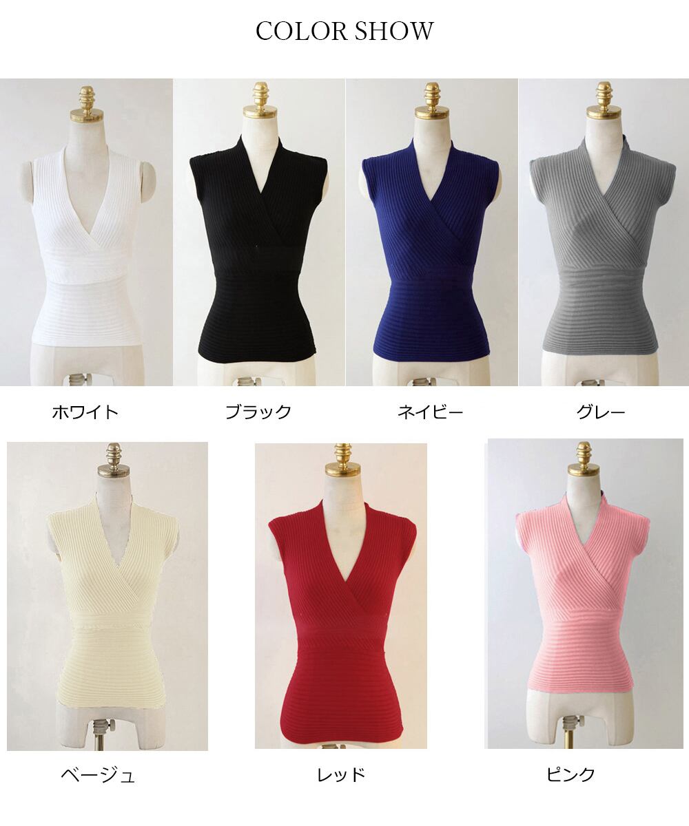 レディース クロップド丈 ノースリーブ ニットカットソー 着やせ セクシー胸元 カシュクール風 ニットウェア 春秋夏