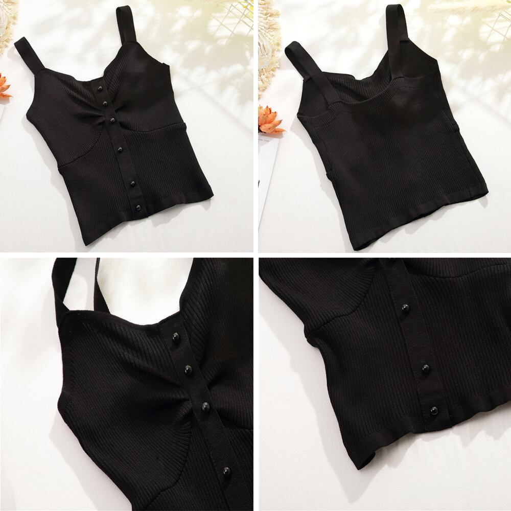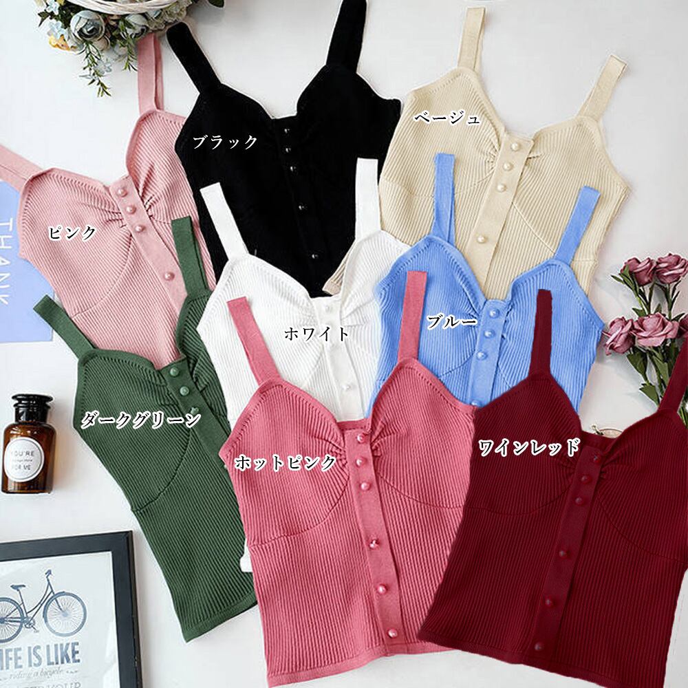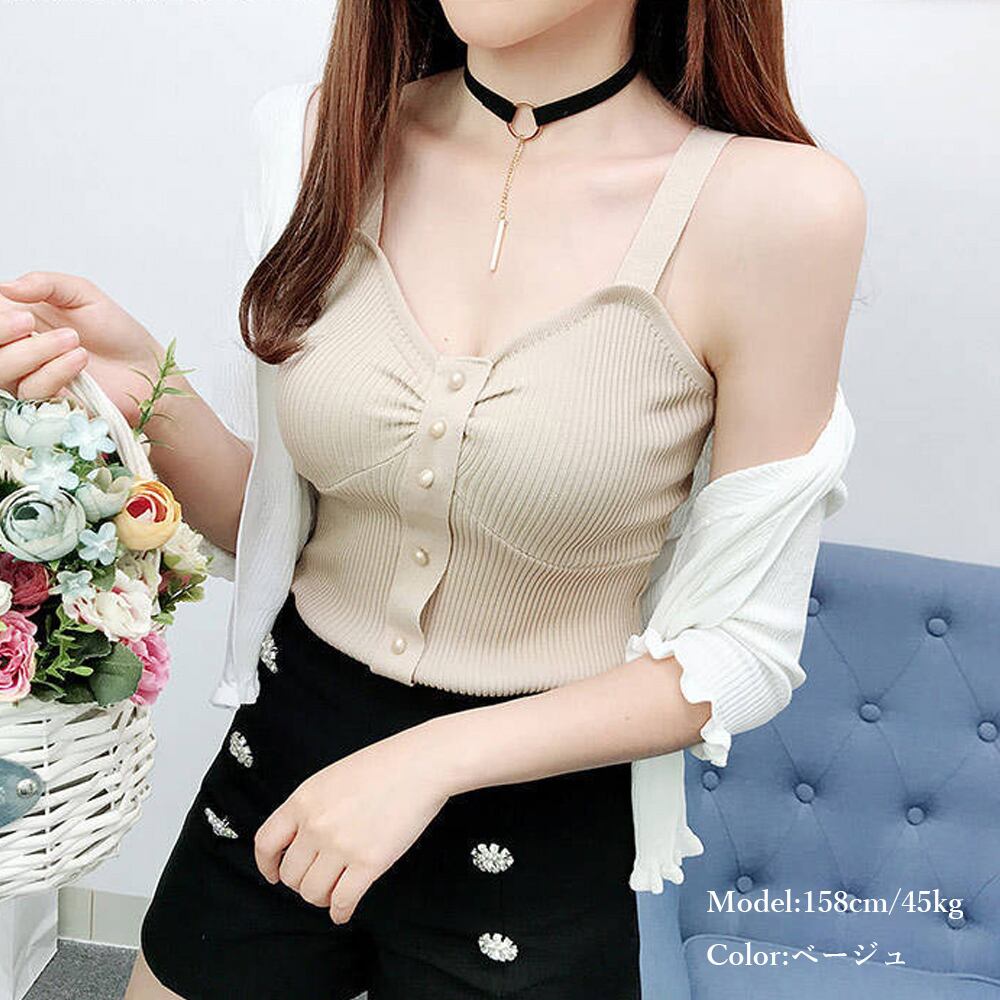 サマーニット フロントボタン vネック タンクトップ 無地 重ね着 インナー ノースリーブ リブニット 着回し