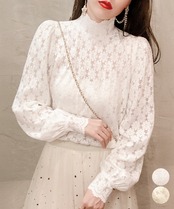ふんわりとボリューム感のある袖のシルエットが可愛い、フラワー柄やレース仕様がポイント、フェミニンの魅力を演出してくれるハイネックブラウス