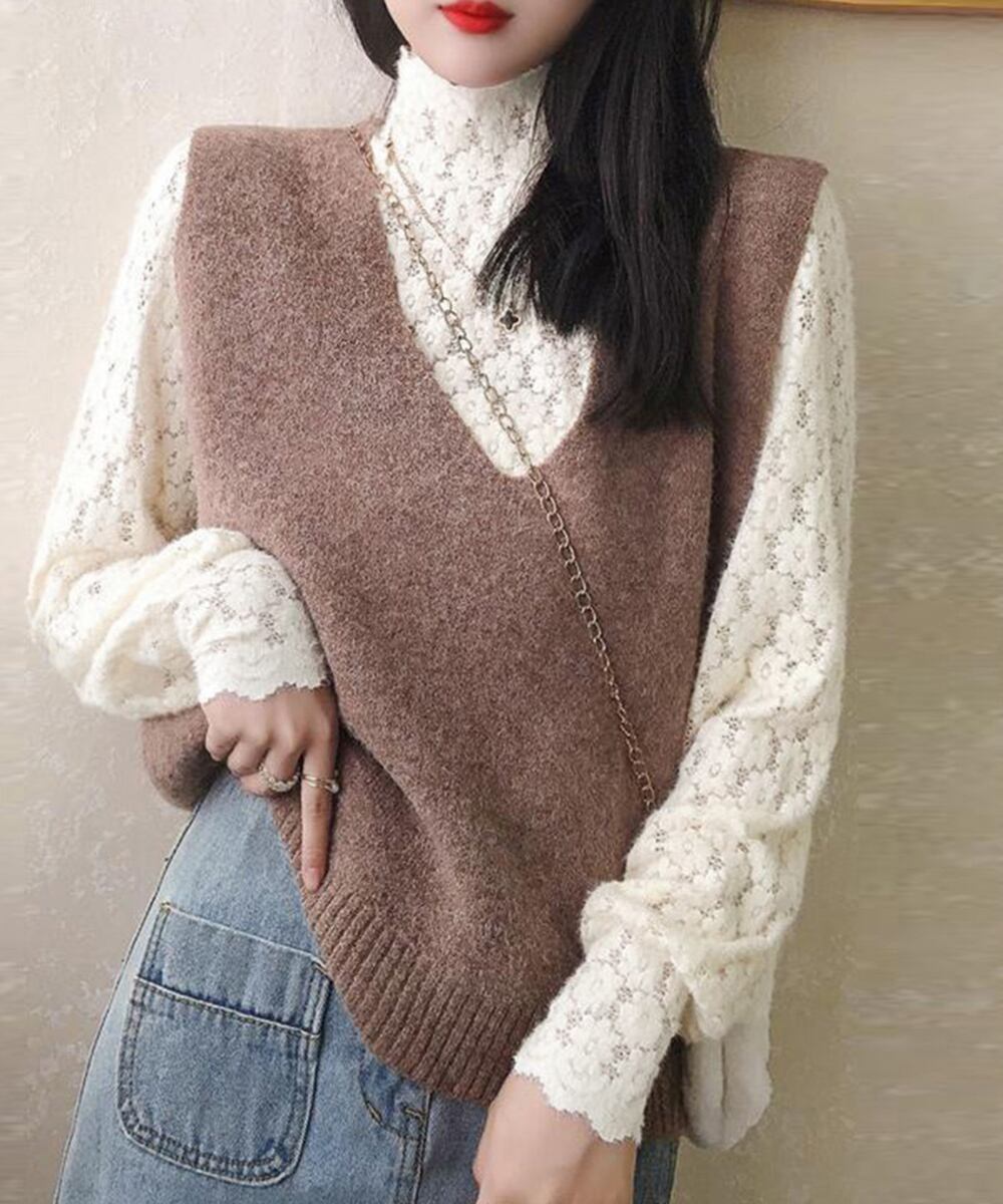 【日本倉庫からの発送】 微起毛 ハイネックレースブラウス 春秋冬 #[2DUOJC-001_16300]【送料込み】【250803】