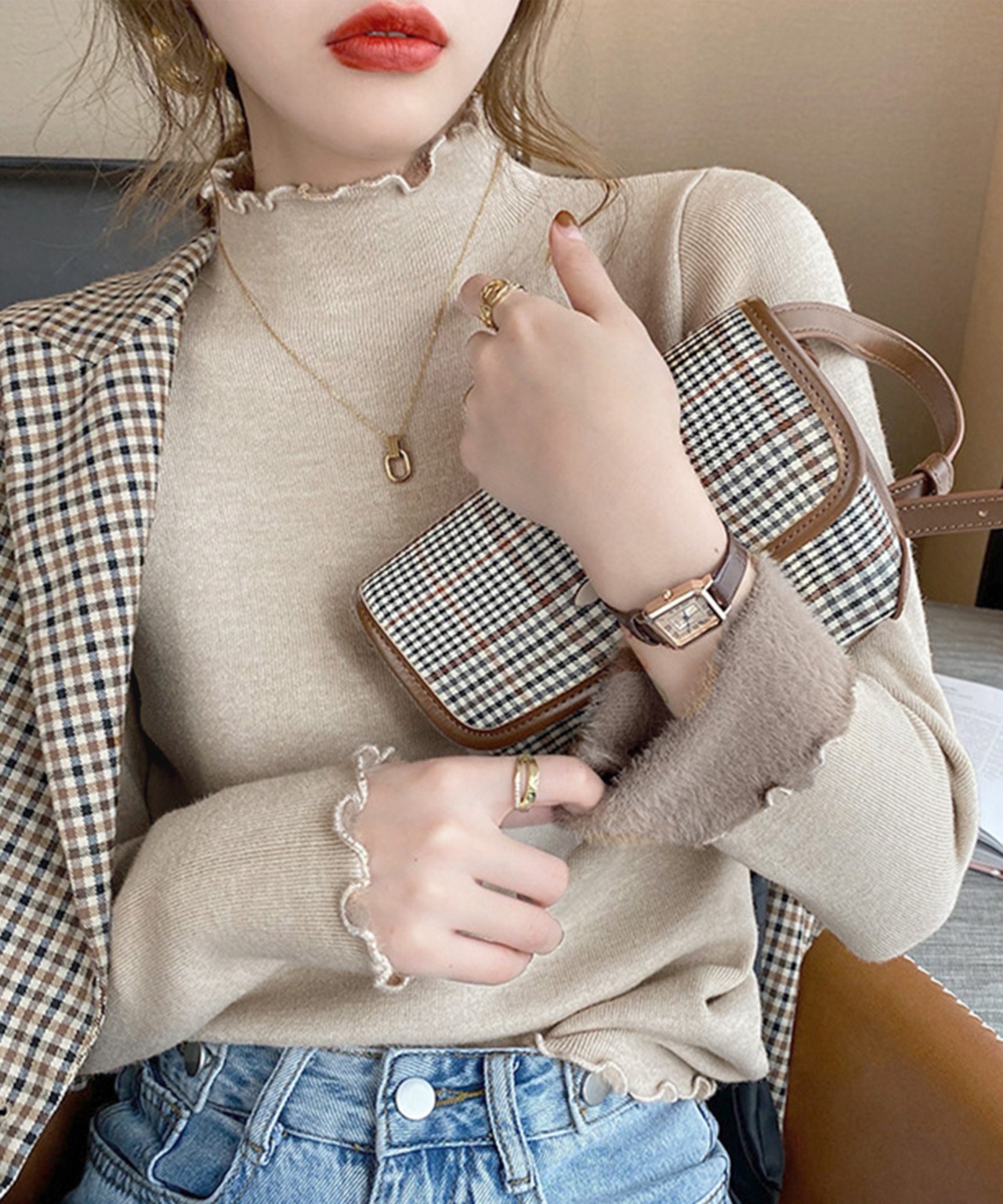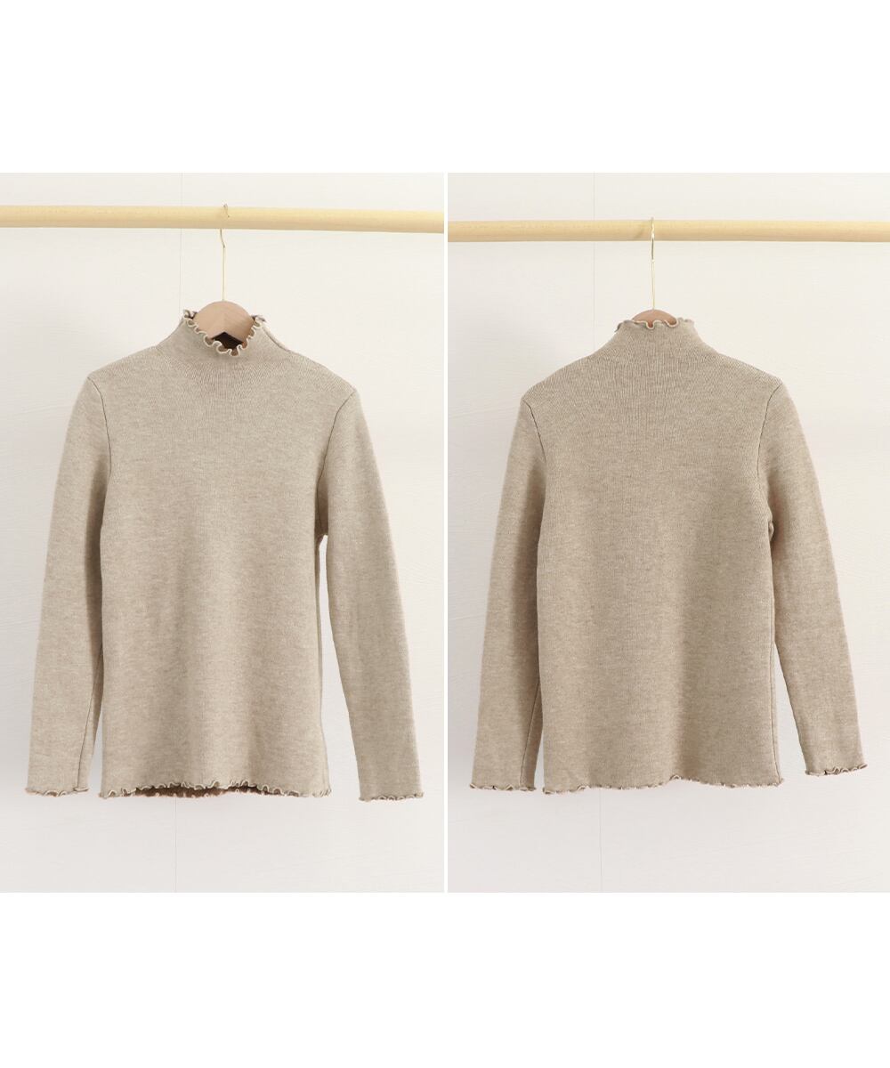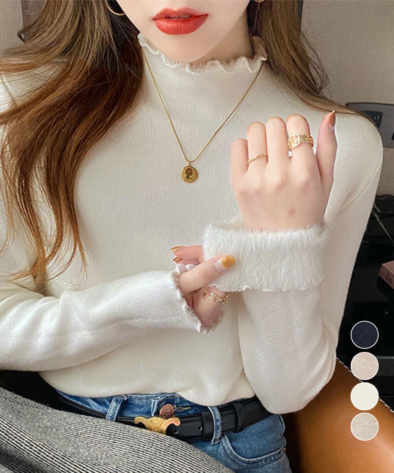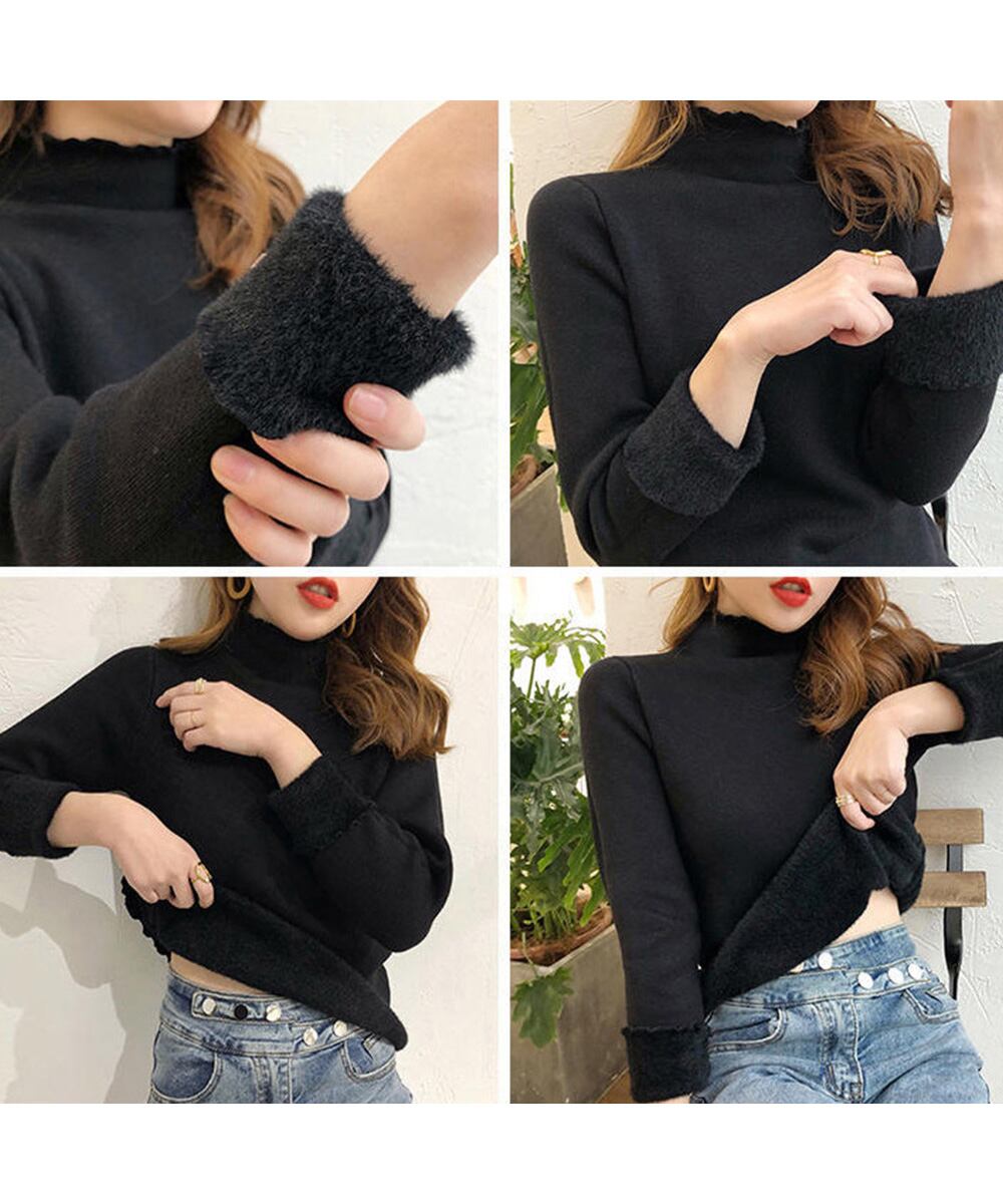 裏面はふんわり柔らかい肌当たりの起毛生地で、熱を逃がさず内側から温もりを与えてくれるハイネックニットトップス