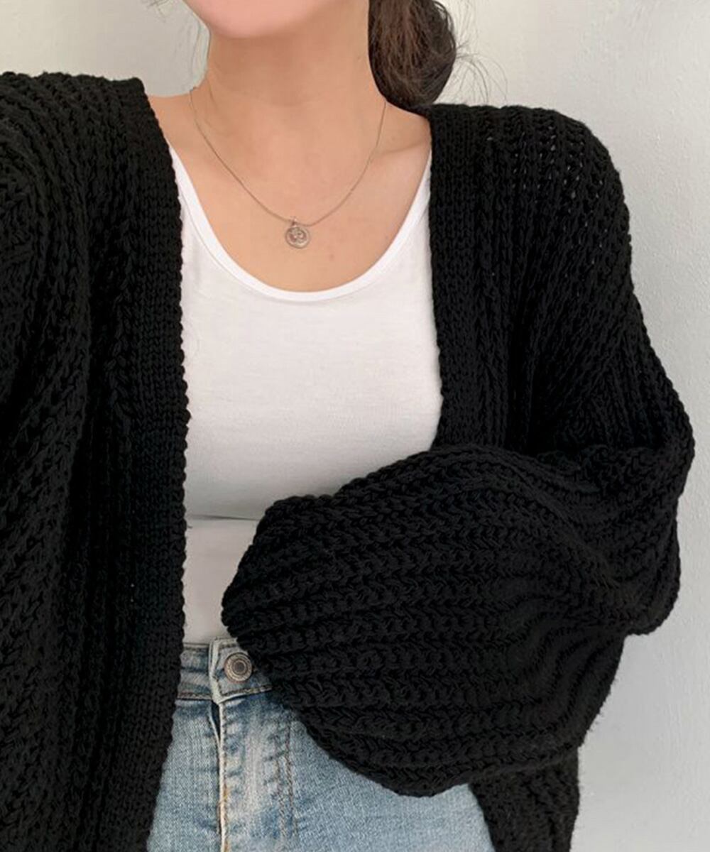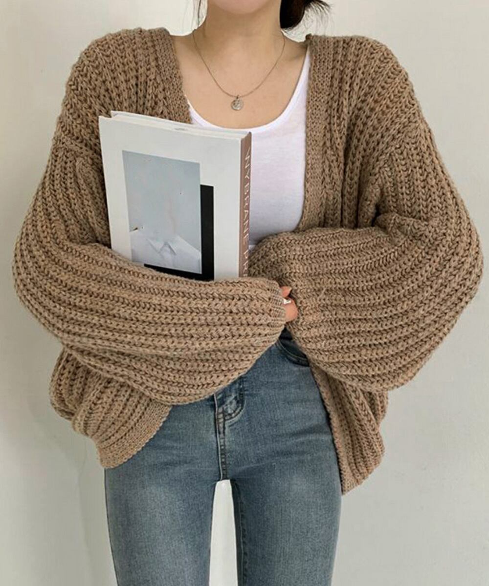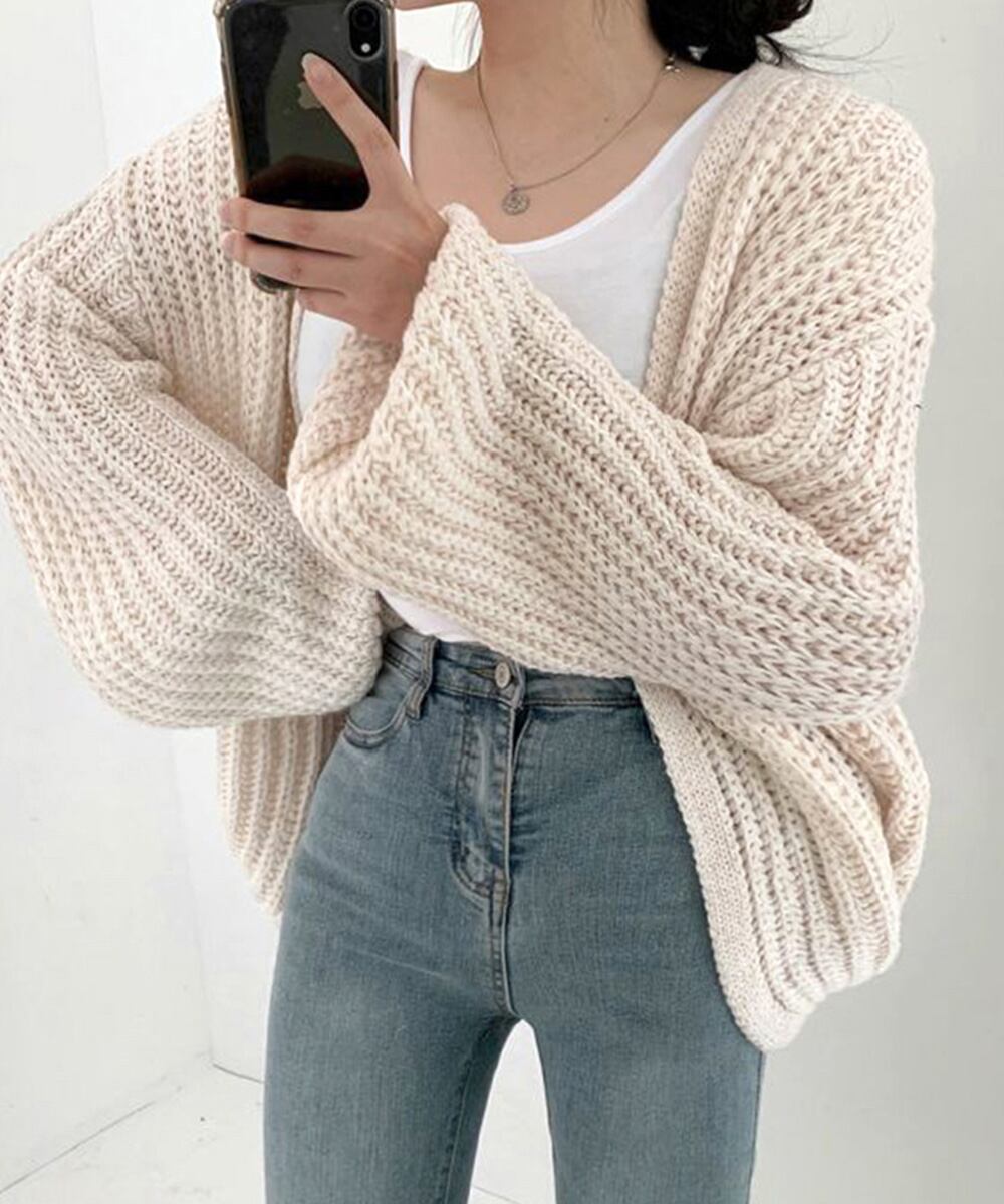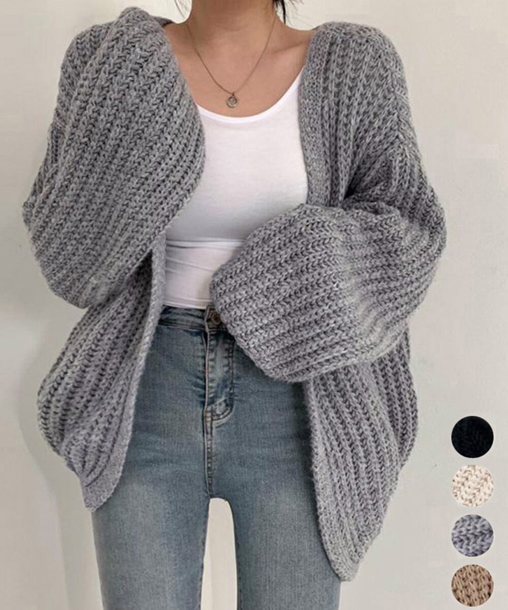カーディガン 韓国風 ゆるニットトップス 体型カバー ボリューム袖 長袖 ニットアウター 羽織り 春秋服 大人カジュアル